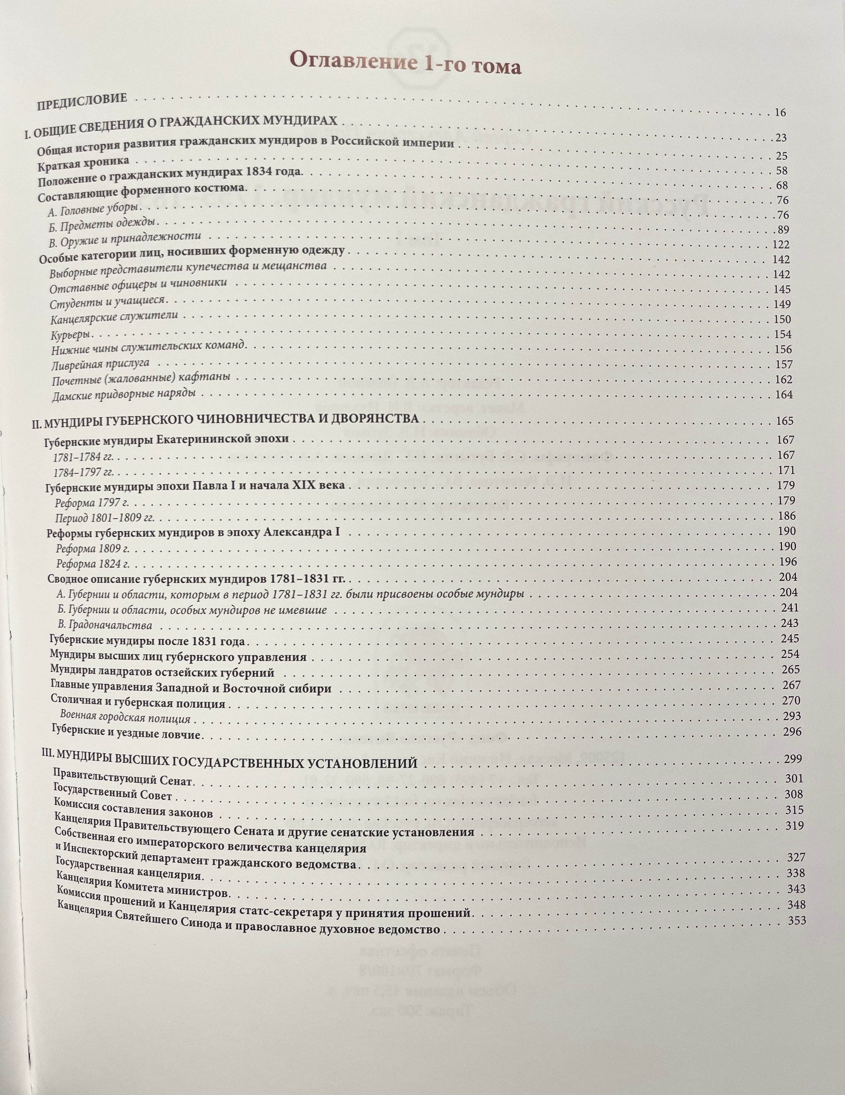 В первый том издания, помимо общей истории гражданских мундиров и описания отдельных элементов форменного костюма, вошли сведения о мундирах губернских дворян и чиновников и служащих высших государственных установлений. Представляет интерес для историков, искусствоведов, музейных работников, художников театра и кино, коллекционеров и всех интересующихся отечественной историей.