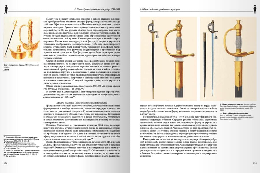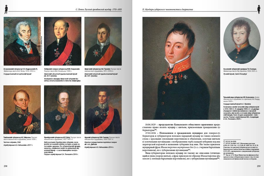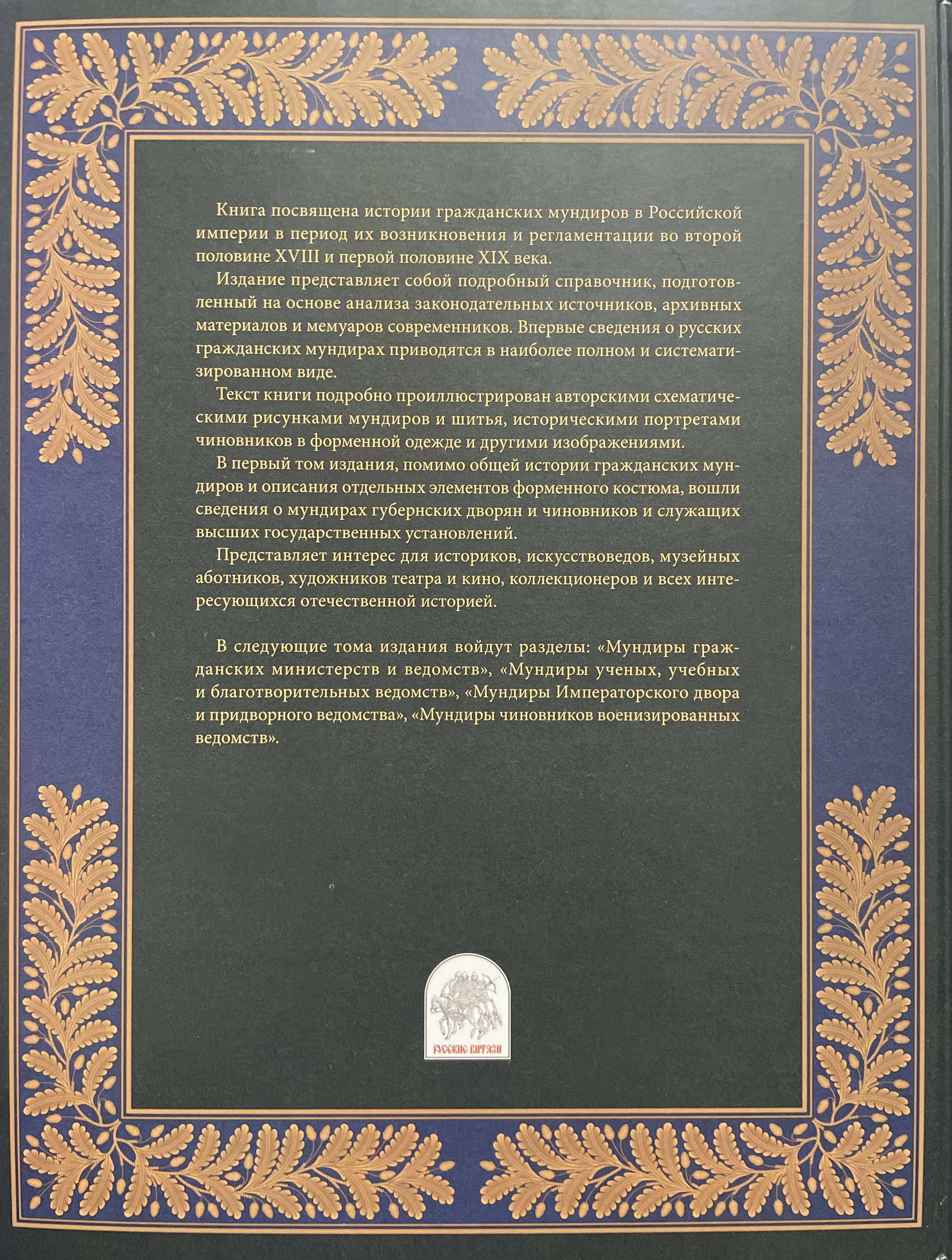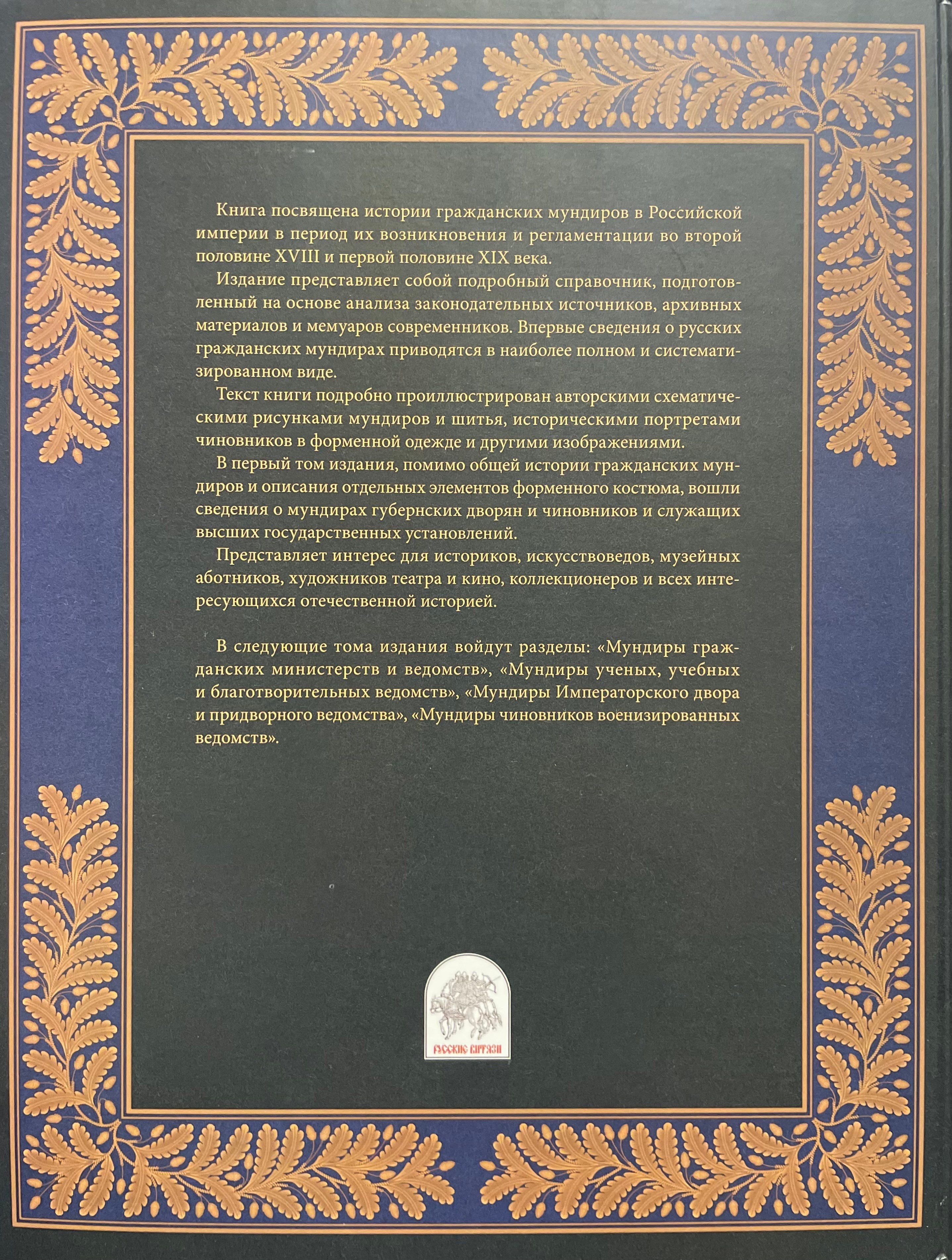 Книга посвящена истории гражданских мундиров в Российской империи в период их возникновения и регламентации во второй половине XVIII и первой половине XIX века. Издание представляет собой подробный справочник, подготовленный на основе анализа законодательных источников, архивных материалов и мемуаров современников. Впервые сведения о русских гражданских мундирах приводятся в наиболее полном и систематизированном виде. Текст книги подробно проиллюстрирован авторскими схематическими рисунками мундиров и шитья, историческими портретами чиновников в форменной одежде и другими изображениями.