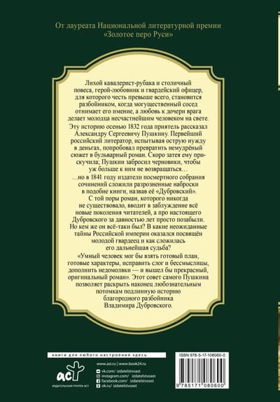 ...но в 1841 году издатели посмертного собрания сочинений сложили разрозненные наброски в подобие книги, назвав её «Дубровский». С той поры роман, которого никогда не существовало, вводит в заблуждение всё новые поколения читателей, а про настоящего Дубровского за давностью лет просто позабыли. Но кем же он всё‑таки был? В какие неожиданные тайны Российской империи оказался посвящён молодой гвардеец, и как сложилась его дальнейшая судьба?
