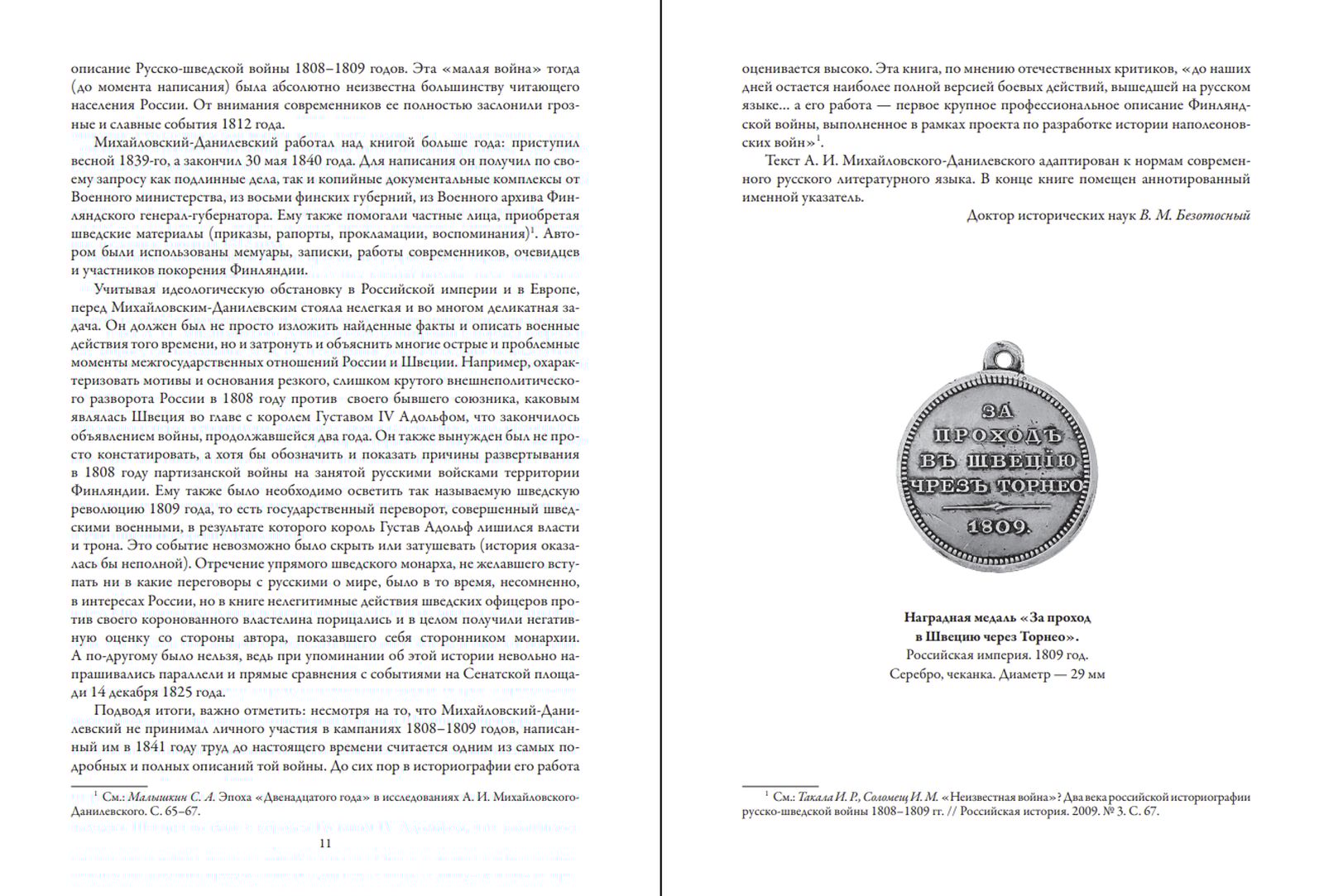 Автор составил описание войны на основе официальных документов, трудов шведских и финских писателей и свидетельств немногих остававшихся в то время живых участников событий. В работе изложены успехи и неудачи воевавших сторон, ошибки полководцев, причины и следствия побед и поражений, мужественная оборона шведов и финнов, преодоление русскими твердой защиты, противопоставленной им и неприятелями, и самой природой, дипломатические перипетии. Книга, изданная в 1841 году и более не переиздававшаяся, не утратила своего значения до настоящего времени, в первую очередь в связи с огромным фактическим материалом, собранным автором. Снабженная научными комментариями и современным справочным аппаратом, она будет представлять интерес как для широкого читателя, так и для специалистов.
