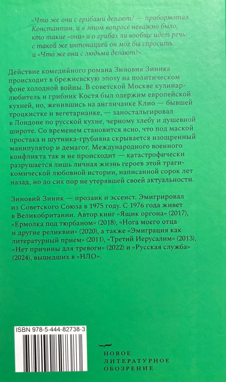 «Что же они с грибами делают? — пробормотал Константин, и в этом вопросе неважно было, кто такие «они» и о грибах ли вообще идет речь: с такой же интонацией он мог бы спросить и «Что же они с людьми делают?». Действие комедийного романа З. Зиника происходит в брежневскую эпоху на политическом фоне холодной войны. В советской Москве кулинар-любитель и грибник Костя был одержим европейской кухней, но, женившись на англичанке Клио — бывшей троцкистке и вегетарианке, — заностальгировал в Лондоне по русской кухне, черному хлебу и душевной широте. Со временем становится ясно, что под маской простака и шутника-грубияна скрывается изощренный манипулятор и демагог. Международного военного конфликта так и не происходит — катастрофически разрушается лишь личная жизнь героев этой трагикомической любовной истории, написанной сорок лет назад, но до сих пор не утерявшей своей актуальности. Зиновий Зиник — прозаик и эссеист. Эмигрировал из Советского Союза в 1975 году. С 1976 года живет в Великобритании. Автор книг «Ящик оргона» (2017), «Ермолка под тюрбаном» (2018), «Нога моего отца и другие реликвии» (2020), а также «Эмиграция как литературный прием» (2011), «Третий Иерусалим» (2013), «Нет причины для тревоги» (2022) и «Русская служба» (2024), вышедших в «НЛО».