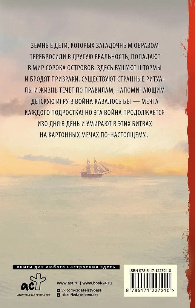 Земные дети, которых загадочным образом перебросили в другую реальность, попадают в мир Сорока Островов. Здесь бушуют штормы и бродят призраки, существуют странные ритуалы и жизнь течет по правилам, напоминающим детскую игру в войну. Казалось бы — мечта каждого подростка! Но эта война продолжается изо дня в день и умирают в этих битвах на картонных мечах по-настоящему...