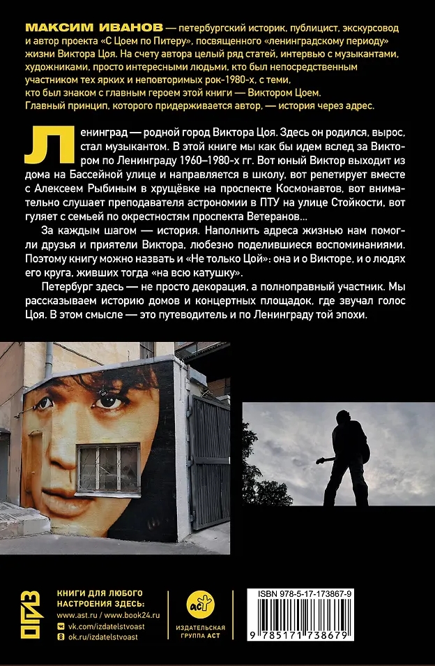 Ленинград — родной город Виктора Цоя. Здесь он родился, вырос, стал музыкантом. В этой книге мы как бы идем вслед за Виктором по Ленинграду 1960–1980-х гг. Вот юный Виктор выходит из дома на Бассейной улице и направляется в школу, вот репетирует вместе с Алексеем Рыбиным в «хрущёвке» на проспекте Космонавтов, вот внимательно слушает преподавателя астрономии в ПТУ на улице Стойкости, вот гуляет с семьей по окрестностям проспекта Ветеранов...