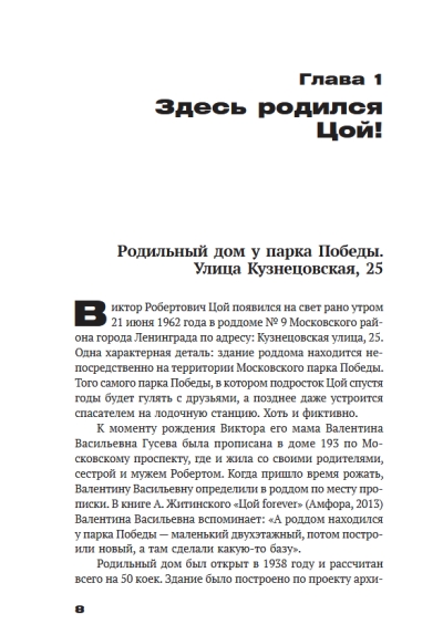 За каждым шагом — история. Наполнить адреса жизнью нам помогли друзья и приятели Виктора, любезно поделившиеся воспоминаниями. Поэтому книгу можно назвать и «Не только Цой»: она и о Викторе, и о людях его круга, живших тогда «на всю катушку».