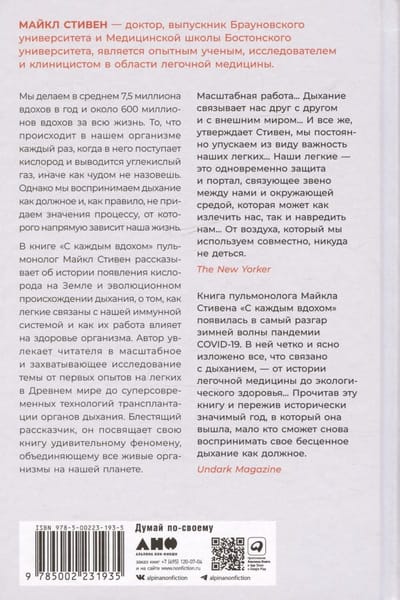 В книге «С каждым вдохом» пульмонолог Майкл Стивен отправляется в путешествие, чтобы пролить оригинальный и необходимый свет на наши легкие. Он рассказывает об истории появления кислорода на Земле и эволюционном происхождении дыхания, исследует целительную силу дыхания и его духовный потенциал. Он доступным языком объясняет, как легкие связаны с нашей иммунной системой и обществом в целом.