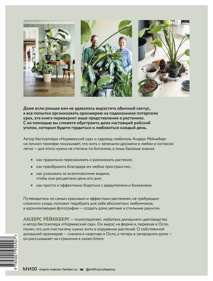 Уход за растениями приносит нам пользу самыми разными способами. Он радует душу, особенно сейчас, когда все мы страдаем от стресса и слишком погружены в виртуальную среду. Когда мы помогаем нашим растениям расти и процветать, они, в свою очередь, дарят нам не только счастье, но и ощущение, что мы чего-то достигли. В своей новой книге Андерс Рёйнеберг собрал все, что вам нужно знать о том, как сохранить домашние растения счастливыми и здоровыми. После публикации «Норвежского сада» Андерс переехал из городской квартиры в загородный дом, который уже превратил в цветущий оазис. В этой книге вы найдете множество новых советов как по уходу за растениями, так и по обустройству пространства с их помощью. Книга наполнена вдохновением и полезными советами, предназначенными как для новичков, так и для тех, кто уже разбирается в мире растений.