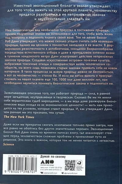 Представляя будущее, мы обычно воображаем себя встроенными в механизированную экосистему, населенную роботами, аппаратами и виртуальными реальностями. Будущее радужно и технологично, и мы, люди, — единственные живые действующие лица в этом прекрасном мире. Однако такое представление — большая ошибка, заявляет биолог и эколог Роб Данн. Как бы мы ни пытались подчинить себе природу, мы остаемся ее частью и непосредственно зависим от нее. В книге «С нами или без нас» Данн рассказывает о биологических законах, столь же непреложных, как законы физики, о том, как меняется окружающий нас мир, какая участь ожидает известные нам виды и где и как будут формироваться новые. При этом за долгую историю своей жизни на планете человечество невольно истребило дикие виды, от которых зависело или могло зависеть, и одновременно способствовало возникновению видов, создающих нам неприятности.