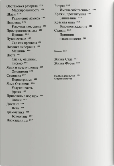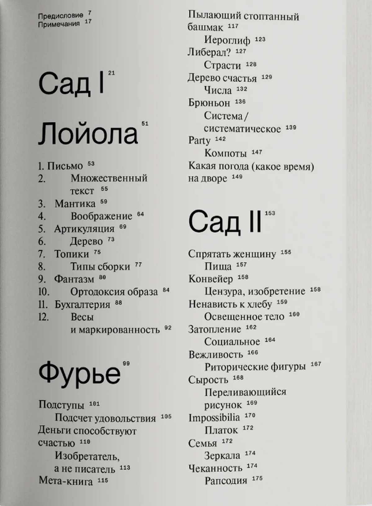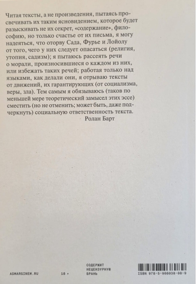 Провозгласив смерть автора, Ролан Барт в книге «Сад, Фурье, Лойола» (1971) обращается к жизни и текстам трех личностей, никак не связанных друг с другом ни биографически, ни в терминах конвенциональной истории литературы и философии. Сцепляя в одном триптихе проклятого философа-либертена де Сада, великого утописта Шарля Фурье и святого иезуита Игнатия де Лойолу, Барт представляет их как «основателей» языков — логотетов, которые интересуют его не как авторы «высказываний», а как создатели грамматик — машин письма, воплощающих перформативную силу языка. У всех троих акт речи не выражает внутреннее, но создает внешнее: пространство, тело, режим. В замке, монастыре, фаланстере читателю предлагается испытать удовольствие от текста — воспринять и присвоить не его содержание, но заложенные в нем дискурсивные формулы, фантазматический порядок, спроецированный на повседневность, — жить вместе с Садом, Фурье, Лойолой.