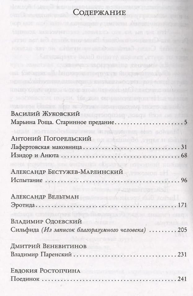 В сборник вошли редкие повести В. Жуковского, А. Погорельского, А. Бесстужева-Марлинского, А. Вельтмана, В. Одоевского, Д. Веневитова, Е. Растопчиной, А. Герцена, Е. Ган, А. Фета.