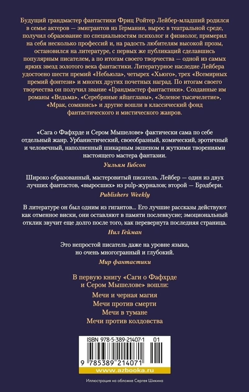 За многие десятилетия до «Ведьмака» и Джорджа Мартина вселенной меча и магии правил Фриц Лейбер. В эту книгу вошли четыре сборника произведений о приключениях любимых антигероев грандмастера — варвара-рубаки, умеющего недурно петь, и пронырливого воришки, владеющего приемами магии. Фэнтезийный дуэт, изначально задуманный автором в качестве тонкой пародии на говардовского Конана, быстро обрел собственную уникальную судьбу и столь же быстро прославился. В мрачном мире под названием Невон Фафхрд и Серый Мышелов без колебаний ввязываются в самые невероятные переделки, совершают чудеса выживания и никогда не теряют человечности и чувства юмора.