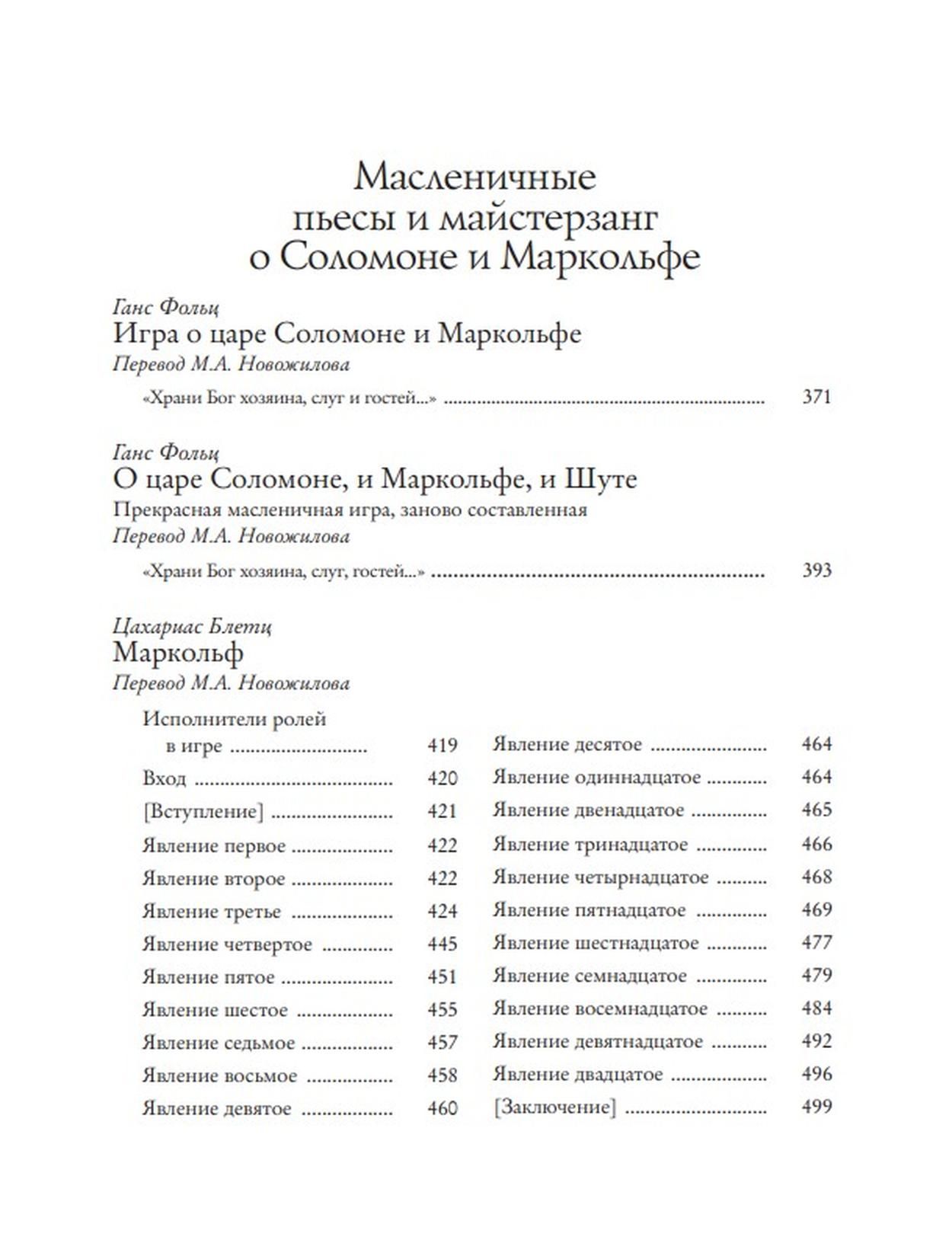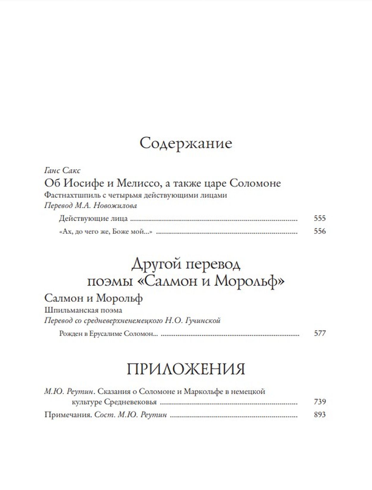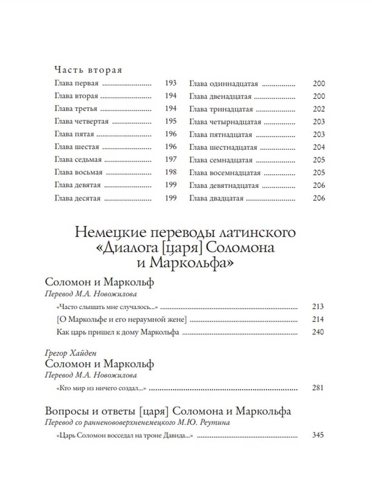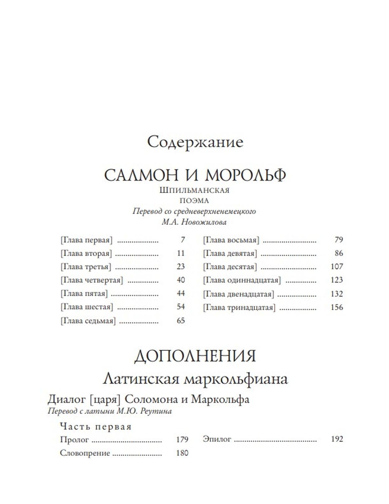 В настоящий том входят полные переводы всех произведений немецкой маркольфианы — самой развитой из национальных Маркольфических традиций средневековой Европы. К этим произведениям относятся шпильманский эпос конца XII века «Салмон и Морольф» (в терминологии Веселовского — «Маркольф I»); латинский комический «Диалог Соломона и Маркольфа» («Маркольф II»); три немецкоязычных перевода-переложения «Диалога» XIV и XV веков и пять масленичных пьес (фастнахтшпилей) XV и XVI веков, написанных нюрнбергскими майстерзингерами Г. Фольцем, Г. Саксом и люцернским драматургом Ц. Блетцем.