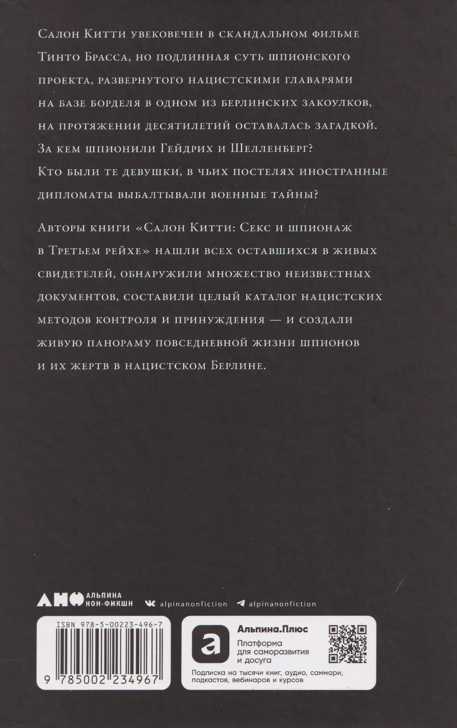 Международная команда историков на протяжении нескольких лет выясняла, что стоит за мифом о «Салоне Китти» — центре международного шпионажа, созданном нацистскими главарями на базе берлинского борделя средней руки. Кем была пресловутая Китти Шмидт — и почему ее «салон» продолжал работать и после войны? На что рассчитывали — и чего добились — Гейндрих и Шелленберг? Как островок «Веймарского Берлина» сохранился в гитлеровской Германии — и какие метаморфозы ему пришлось пережить? Как выглядела сексуальная повседневность граждан Третьего Рейха — и как одержимые вуайеризмом нацисты пытались регулировать рынок связанных с сексом услуг?