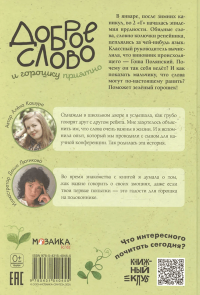 После зимних каникул во 2 «Г» началась эпидемия вредности. Обидные слова, словно колючки репейника, цеплялись за чей-нибудь язык. Классный руководитель вычислила, что виновник происходящего — Гоша Полянский. Почему он так себя ведет? И как показать мальчику, что слова могут по-настоящему ранить? Поможет необычный эксперимент и зеленый горошек!
