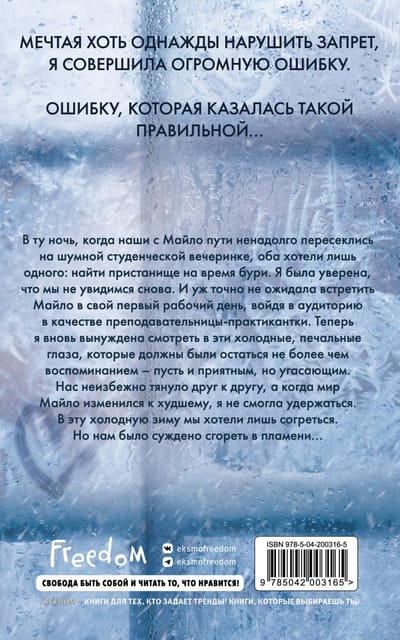 В ту ночь, когда наши с Майло пути ненадолго пересеклись на шумной студенческой вечеринке, оба хотели лишь одного: найти пристанище на время бури. Я была уверена, что мы не увидимся снова. И уж точно не ожидала встретить Майло в свой первый рабочий день, войдя в аудиторию в качестве преподавателя-практиканта. Теперь я вновь вынуждена смотреть в эти холодные, печальные глаза, которые должны были остаться не более чем воспоминанием — пусть и приятным, но угасающим. Нас неизбежно тянуло друг к другу, а когда мир Майло изменился к худшему, я не смогла удержаться и, несмотря на запрет, прижалась еще ближе.