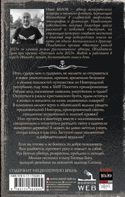 Итак, судари мои и сударыни, не желаете ли отправиться в новое увлекательное, мрачное, временами безумное и полное опасностей путешествие по Новгородской республике, году этак в 1668? Посетить примороженные Гиблые леса, населенные мавками, умертвиями и чудью? Окунуться в ужасы крестьянского бунта, чудом остаться в живых и поглазеть на казнь захваченных главарей? В компании милого черта и обаятельной ведьмы увидеть предновогодний Новгород, припорошенный снегом, празднично украшенный и залитый кровью? Или пуститься в авантюру вместе с малознакомым священником и попытаться разгадать тайну в одночасье вымерших деревень? А может, вы давно мечтали узнать, откуда взялся и как стал Заступой один знаменитый и добродетельный вурдалак?