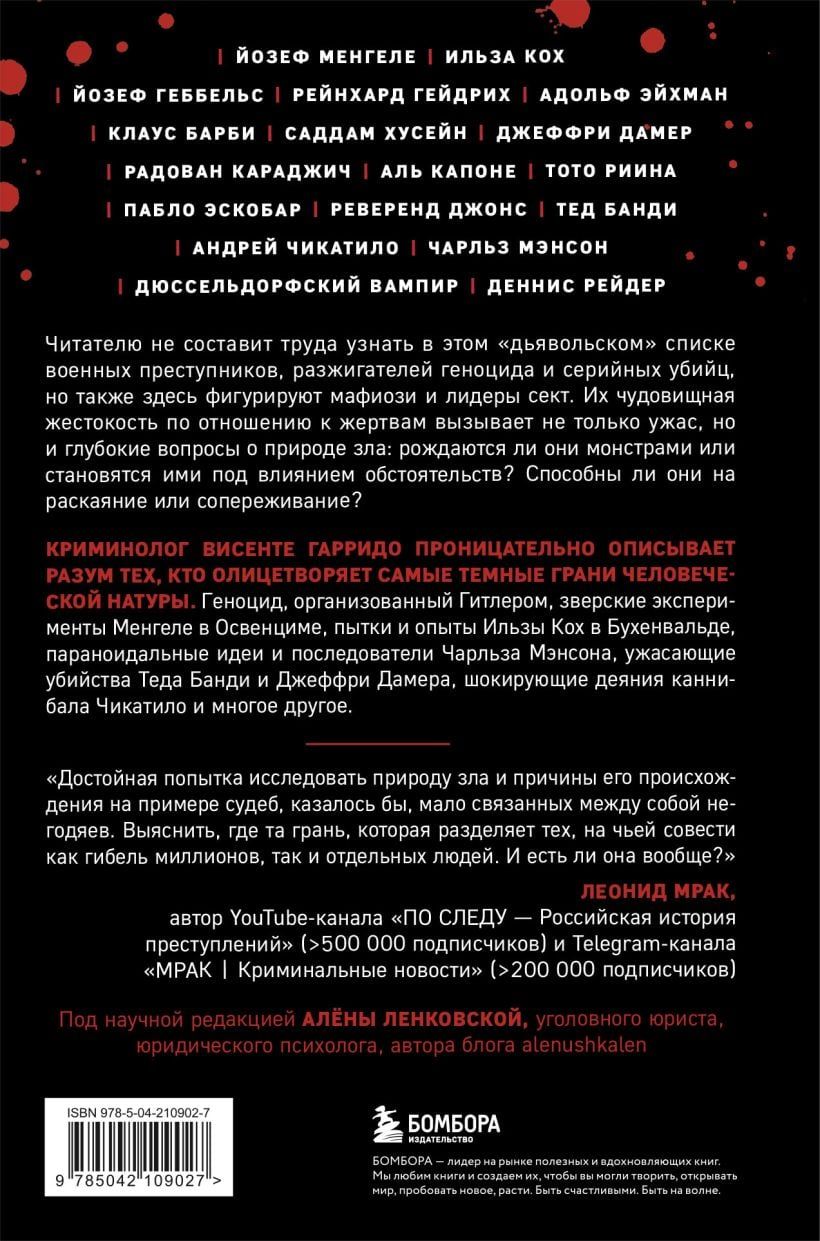 «Самые жестокие преступники» - это отвратительная коллекция злодеев не только среди серийных убийц, но и политических деятелей и нацистских преступников. У всех них, в разной степени, присутствует психопатия, патологический нарциссизм, склонность к садизму, параноидальная ментальность и умение скрывать свои преступления или казаться благодетелями. Автор книги глубоко анализирует причины их преступлений, мотивы и идеи, которым они слепо верили. Геноцид, организованный Гитлером, зверские эксперименты Менгеле в Освенциме, пытки и опыты Ильзы Кох в Бухенвальде, параноидальные идеи и последователи Чарльза Мэнсона, ужасающие убийства Теда Банди и Джеффри Дамера, шокирующие деяния каннибала Чикатило и многое другое.