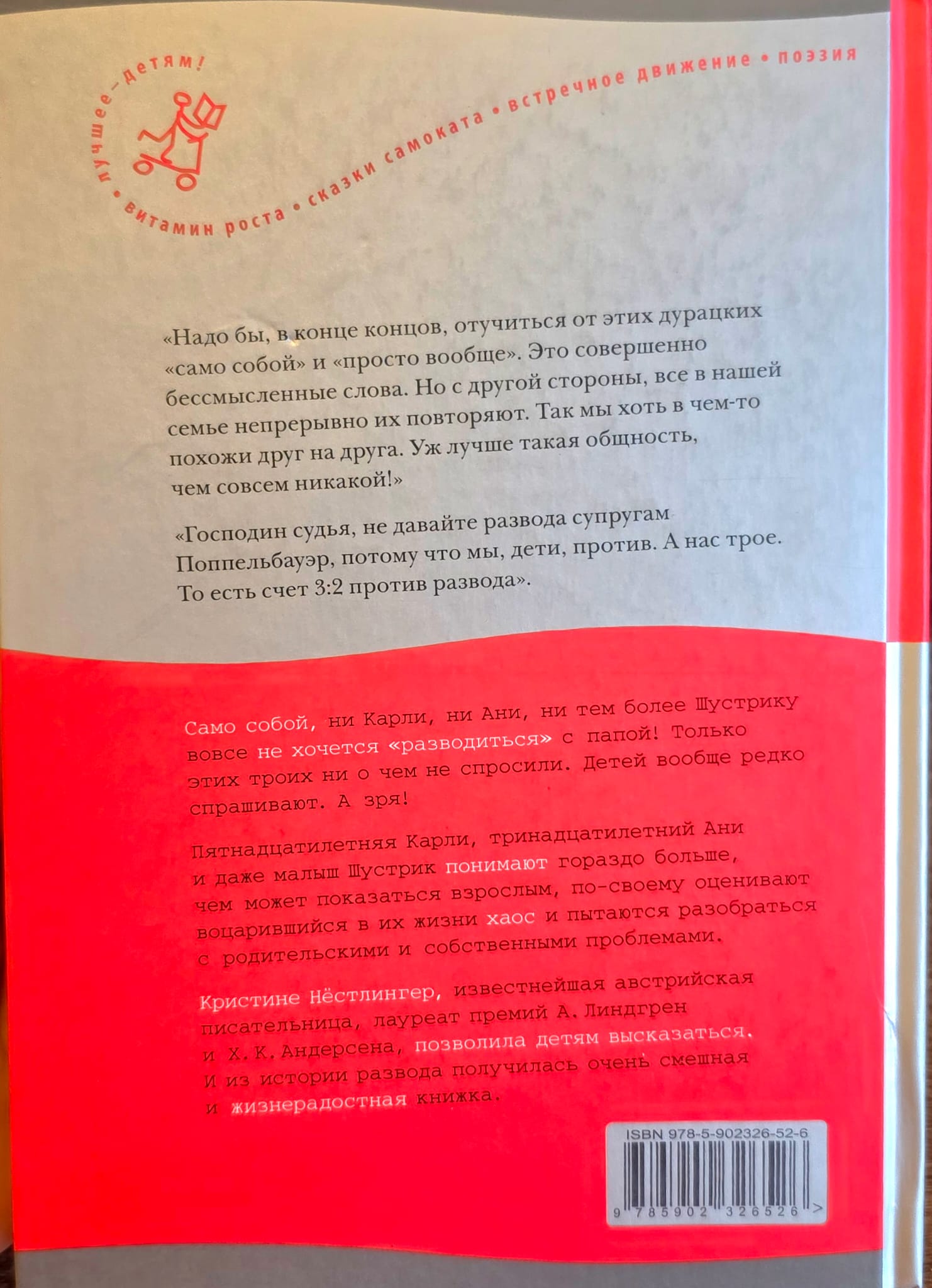 Кристине Нёстлингер - австрийская писательница, автор более 100 книг для детей и подростков, лауреат премий им. А. Линдгрен (2003) и Х. -К. Андресена (1984), позволила детям высказаться. И из истории развода получилась очень смешная и жизнерадостная книжка.