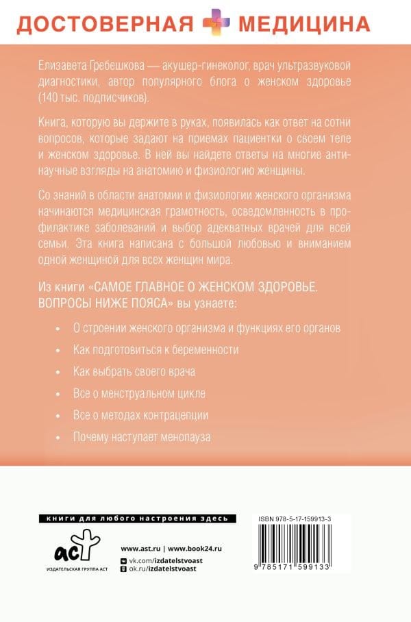 Книга, которую вы держите в руках, появилась как ответ на сотни вопросов, которые задают на приемах пациентки о своем теле и женском здоровье. В ней вы найдете ответы на многие антинаучные взгляды на анатомию и физиологию женщины. Со знаний в области анатомии и физиологии женского организма начинаются медицинская грамотность, осведомленность в профилактике заболеваний и выбор адекватных врачей для всей семьи. Эта книга написана с большой любовью и вниманием одной из женщин для всех женщин мира. Из книги «Самое важное о женском здоровье. Вопросы ниже пояса» вы узнаете: - О строении женского организма и функциях его органов; - Как подготовиться к беременности? - Как выбрать своего врача? - Все о менструальном цикле; - Все о методах контрацепции; - Почему наступает менопауза?