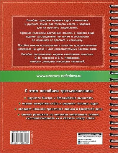 В книгу включён материал по всем основным темам школьного курса математики и русского языка для 3 класса. Пособие содержит правила и задания для их прочного закрепления. Материал пособия распределён по темам и расположен по принципу от простого к сложному. Цель пособия – «разложить всё по полочкам», то есть систематизировать полученные знания и отработать предметные навыки ребёнка на различных видах заданий. Ребёнок научится быстро и безошибочно вычислять, освоит алгоритмы решения типовых задач, овладеет навыком грамотного письма и грамотной речи. Пособие можно использовать в качестве дополнительного материала на уроке и для самостоятельных занятий дома.