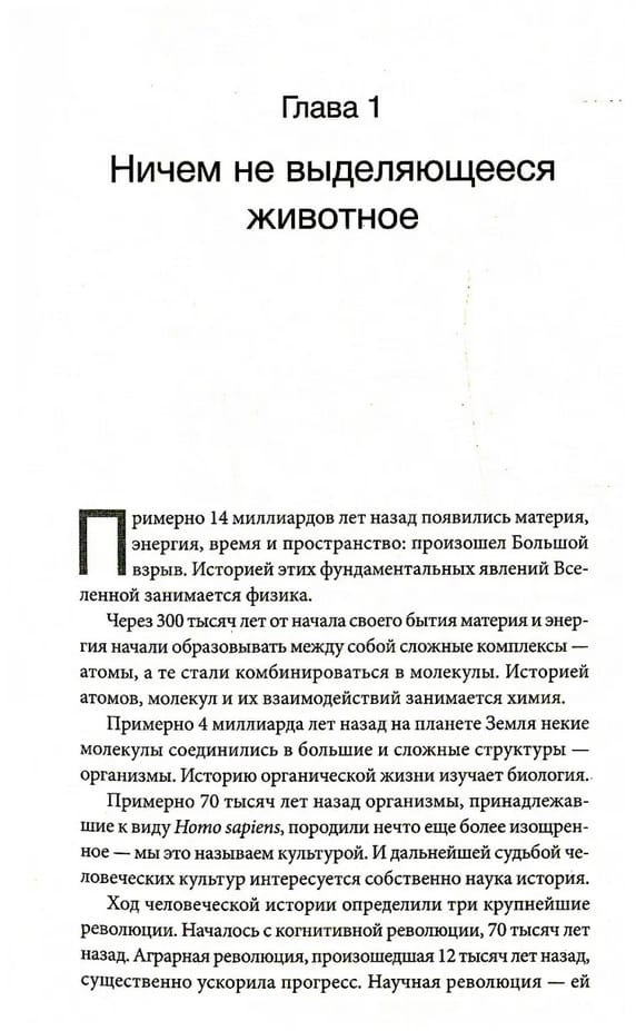 Сто тысяч лет назад Homo sapiens был одним из как минимум шести видов человека, живших на этой планете, - ничем не примечательным животным, которое играло в экосистеме роль не большую, чем гориллы, светлячки или медузы. Но около семидесяти тысяч лет назад загадочное изменение когнитивных способностей Homo sapiens превратило его в хозяина планеты и кошмар экосистемы. Как человек разумный сумел покорить мир? Что стало с другими видами человека? Когда и почему появились деньги, государства и религия? Как возникали и рушились империи? Почему почти все общества ставили женщин ниже мужчин? Как наука и капитализм стали господствующими вероучениями современной эры? Становились ли люди с течением времени счастливее? Какое будущее нас ожидает?