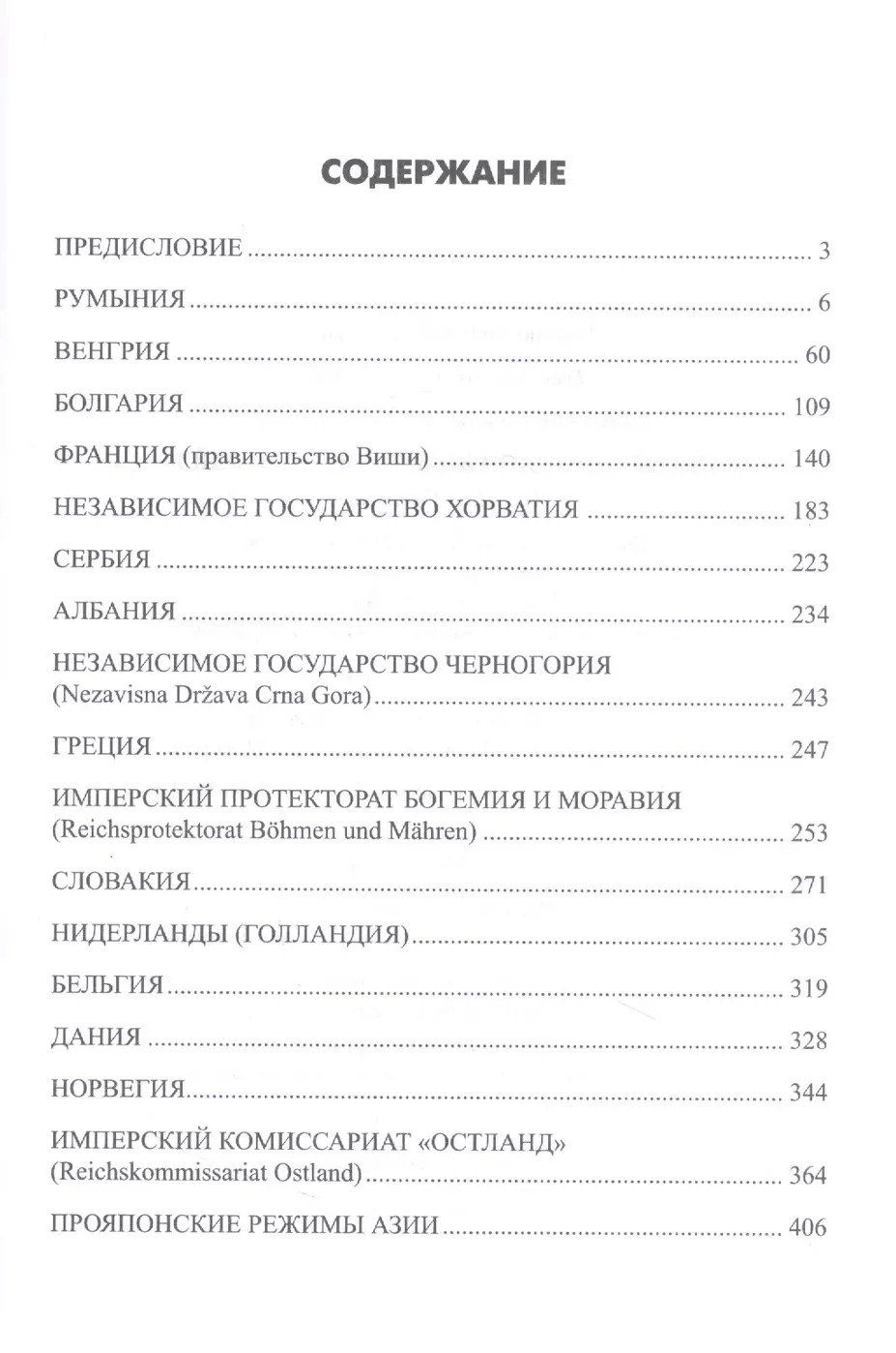 В предлагаемом издании, являющемся продолжением книги «Союзники Германии», рассказывается о правящей и военной элите не только государств-сателлитов, входивших в гитлеровскую коалицию, но также и марионеточных режимов, созданных Германией и Японией, считавшихся «независимыми» исключительно по названию и не признанных в таковом качестве мировым сообществом. Главный раздел книги состоит из биографий высших государственных чиновников и военного руководства Румынии, Венгрии, Болгарии, Франции, Хорватии, Сербии, Албании, Черногории, Греции, Нидерландов, Бельгии, Дании, Норвегии и др.