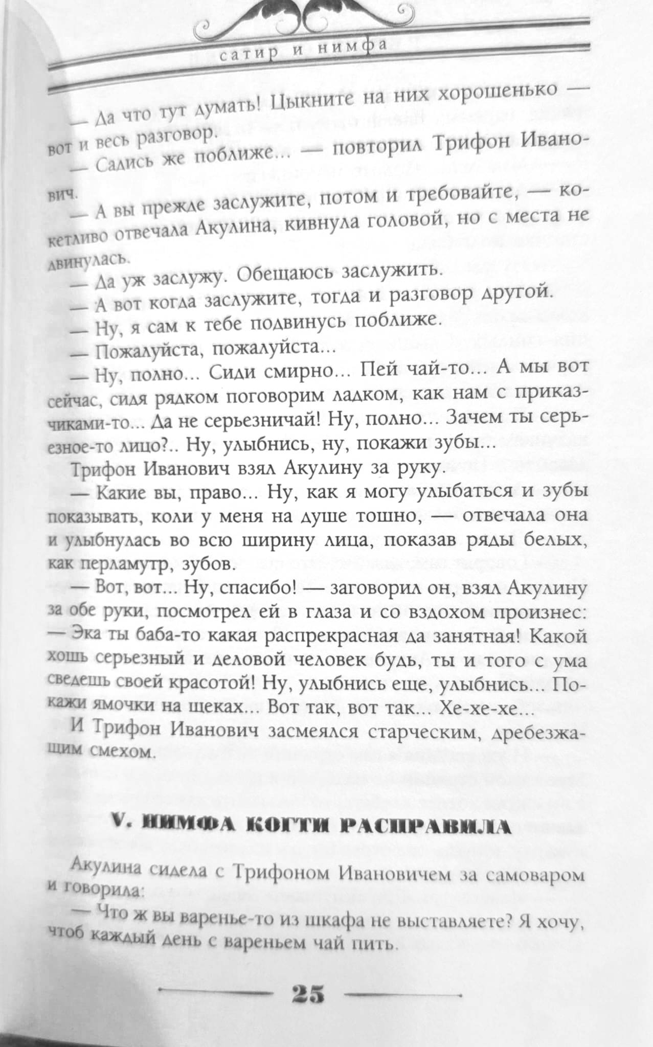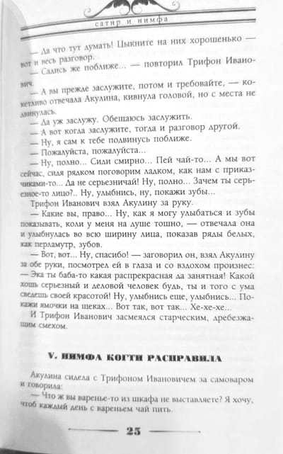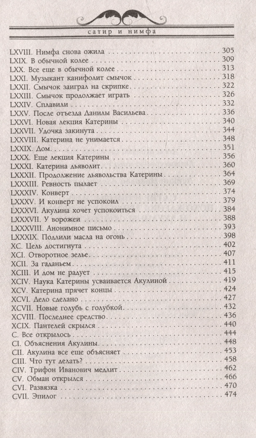 Бытописец России конца XIX — начала XX века, сатирик Николай Александрович Лейкин как всегда точно ухватывает подсмотренные им в жизни образы соотечественников самых разных сословий и характеров. В этом, в чем-то смешном, а в чем-то грустном романе остроумно обыграны самые разные типы персонажей. Одинокий пожилой купец Трифон Иванович Заколов проникается теплыми чувствами к своей кухарке Акулине. Скромная и тихая женщина по-настоящему преображается под влиянием своего нового статуса в доме, и динамика между «сатиром» и «нимфой» кардинально меняется. Подруга-горничная дает Акулине полезные, с ее точки зрения, советы, а родственник из деревни просится на хлебное место, и далеко не сразу ясно, к чему приведет цепь событий, начавшаяся с простой симпатии.