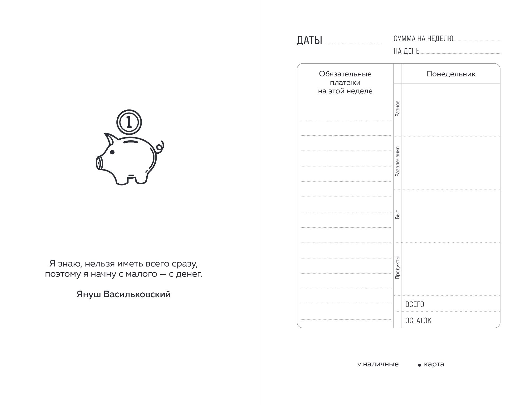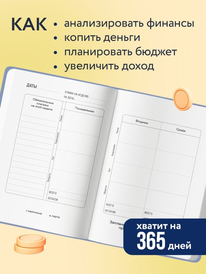 Мягкая обложка, стильный ретро-дизайн и формат А5 — удобно носить с собой. Распределяй бюджет строго и с умом, экономь системно и исполняй свои планы — шаг за шагом, как вклады в сберкнижке.