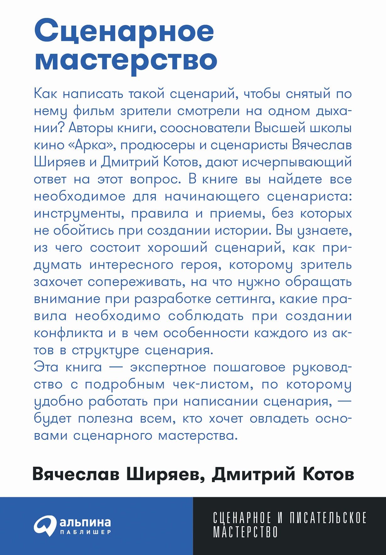 Как написать такой сценарий, чтобы снятый по нему фильм зрители смотрели на одном дыхании? Авторы книги, сооснователи Высшей школы кино «Арка», продюсеры и сценаристы Вячеслав Ширяев и Дмитрий Котов дают исчерпывающий ответ на этот вопрос.