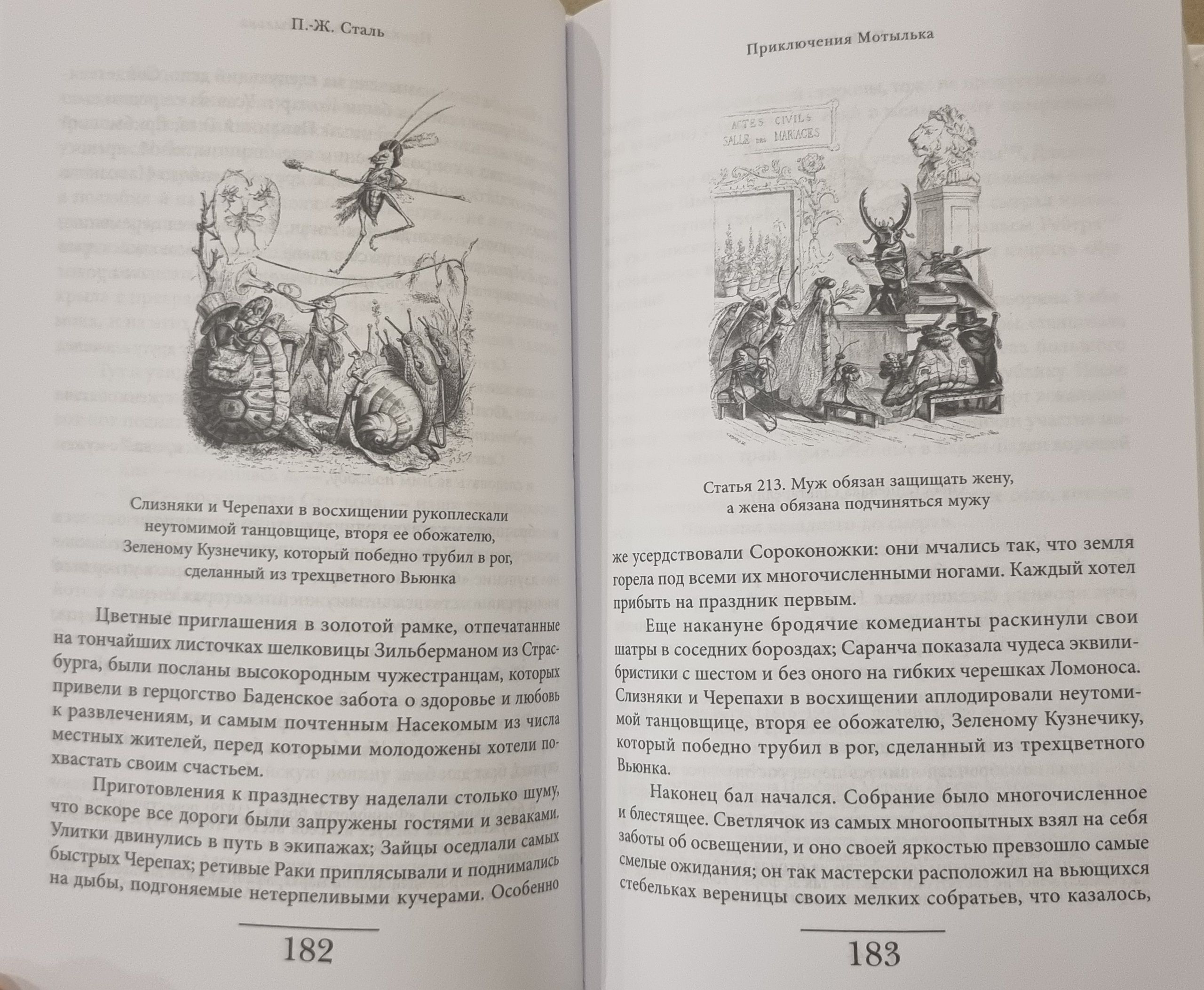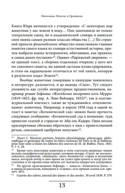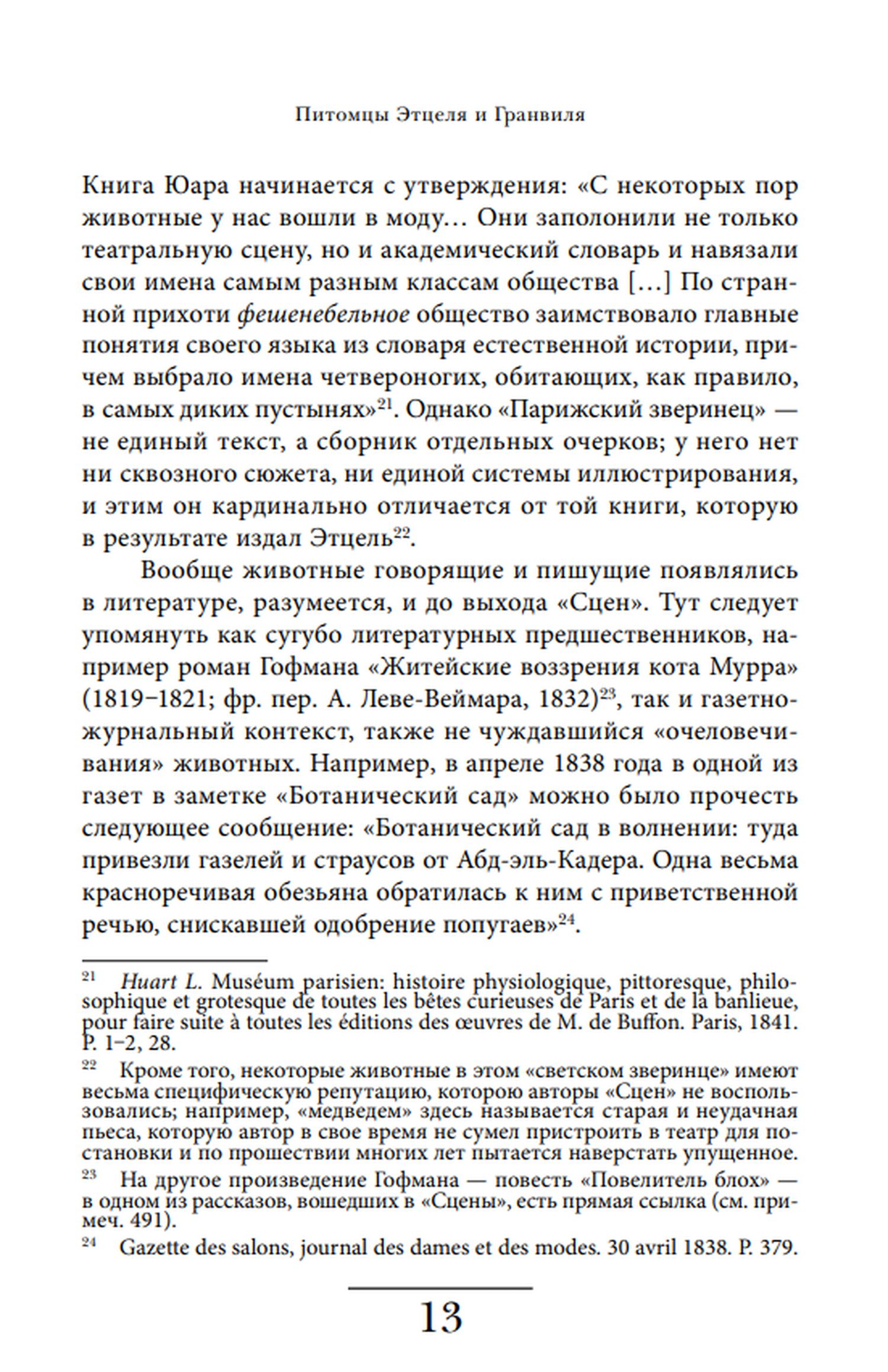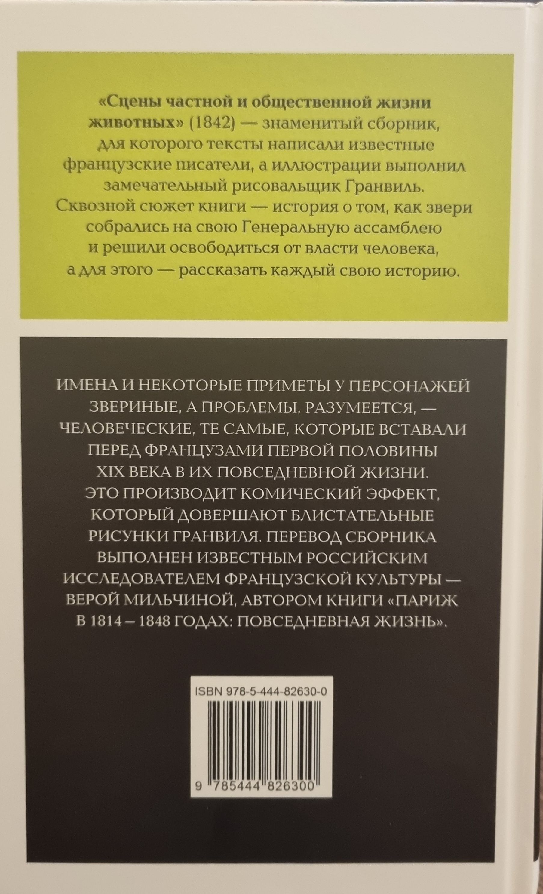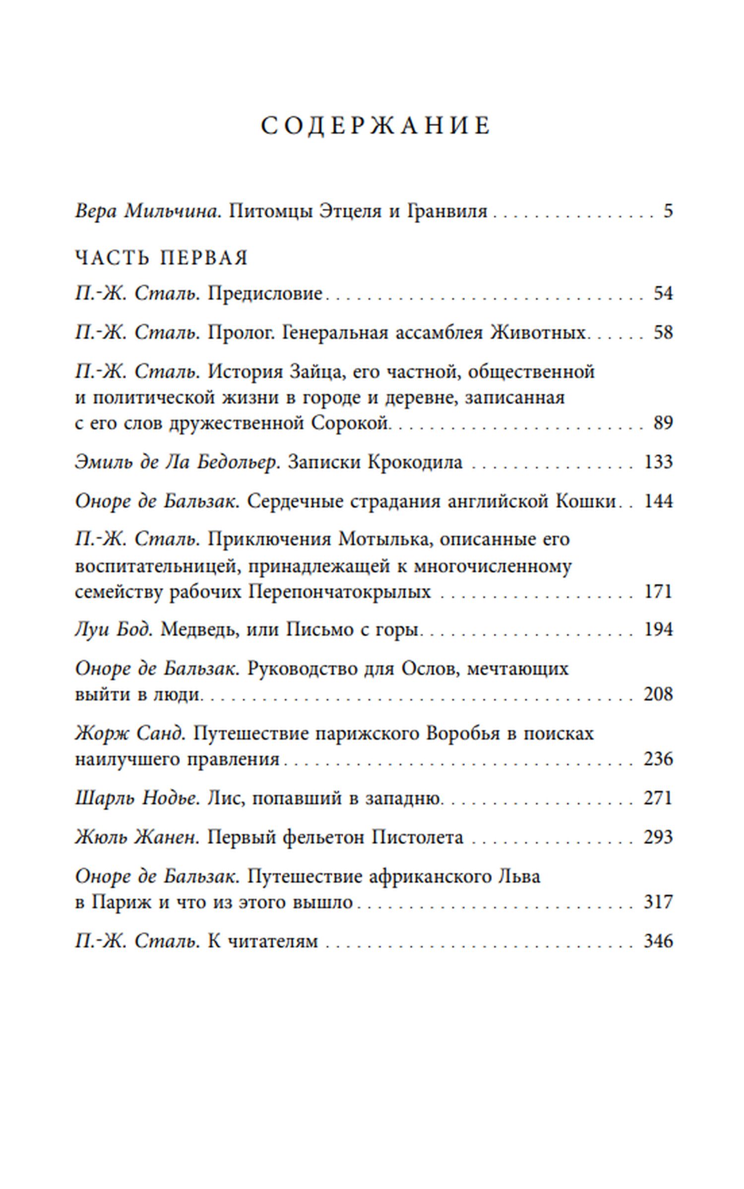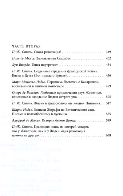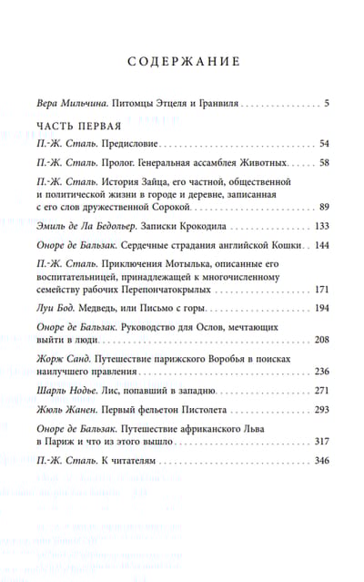 «Сцены частной и общественной жизни животных» (1842) — знаменитый сборник, для которого тексты написали известные французские писатели, а иллюстрации выполнил замечательный рисовальщик Гранвиль. Сквозной сюжет книги — история о том, как звери собрались на свою Генеральную ассамблею и решили освободиться от власти человека, а для этого — рассказать каждый свою историю. Читателя ждут монологи Зайца-конформиста и Медведя-байрониста, Крокодила-эпикурейца и Пуделя, сделавшегося театральным критиком, английской Кошки, осужденной за супружескую измену, и французской Кошки, обманутой Котом-изменником. Имена и некоторые приметы у персонажей звериные, а проблемы, разумеется, — человеческие, те самые, которые вставали перед французами первой половины XIX века в их повседневной жизни. Это производит комический эффект, который довершают блистательные рисунки Гранвиля.