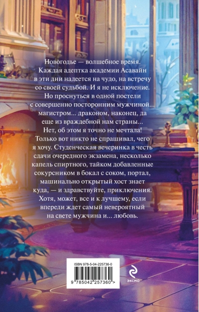 Новогодье — волшебное время. Каждая адептка академии Асавайн в эти дни надеется на чудо, на встречу со своей судьбой. И я не исключение. Но проснуться в одной постели с совершенно посторонним мужчиной… магистром… драконом, наконец, да еще из враждебной нам страны… Нет, об этом я точно не мечтала! Только вот никто не спрашивал, чего я хочу. Студенческая вечеринка в честь сдачи очередного экзамена, несколько капель спиртного, тайком добавленные сокурсником в бокал с соком, портал, машинально открытый хост знает куда, — и здравствуйте, приключения. Хотя, может, все и к лучшему, если впереди ждет самый невероятный на свете мужчина и… любовь.