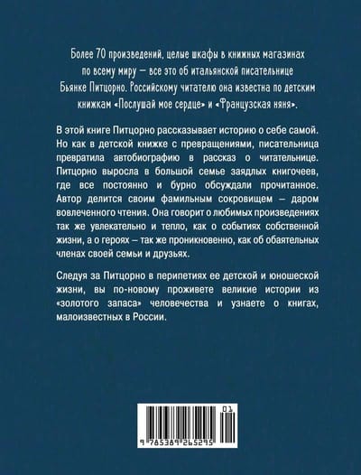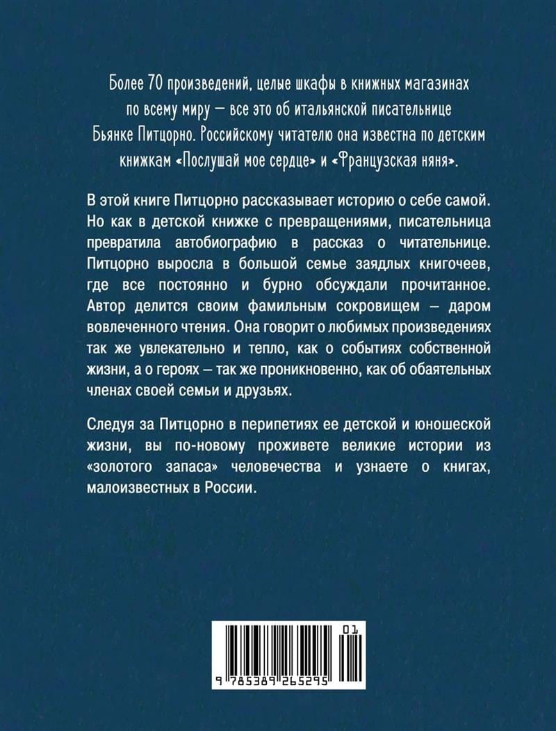 Итальянская писательница Бьянка Питцорно (р. 1942) сегодня входит в число самых популярных детских авторов в мире. Ее знают в основном по книжкам «Послушай мое сердце» и «Французская няня». В новой книге Питцорно рассказывает историю о самой себе. Но книги и герои всегда в ее жизни занимали почти такое же важное место, как друзья и родственники, поэтому автобиография Питцорно — это рассказ и о самых лучших книжках на свете.