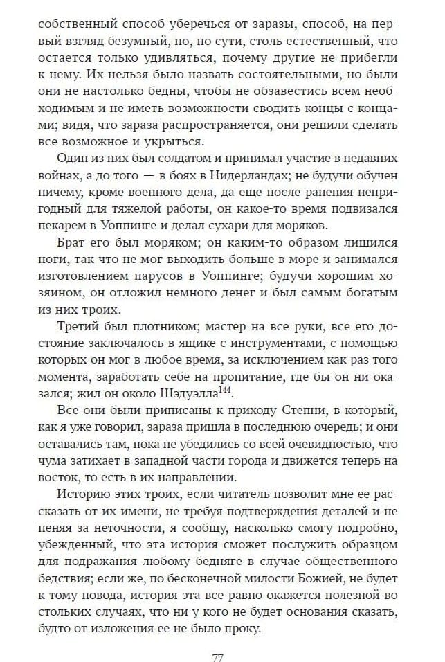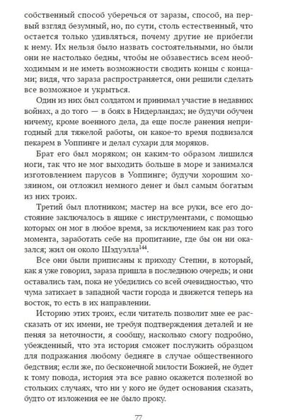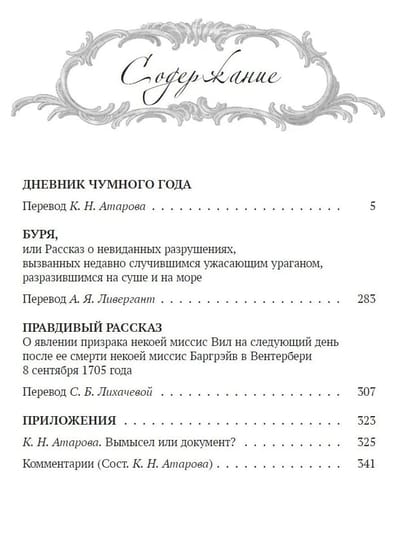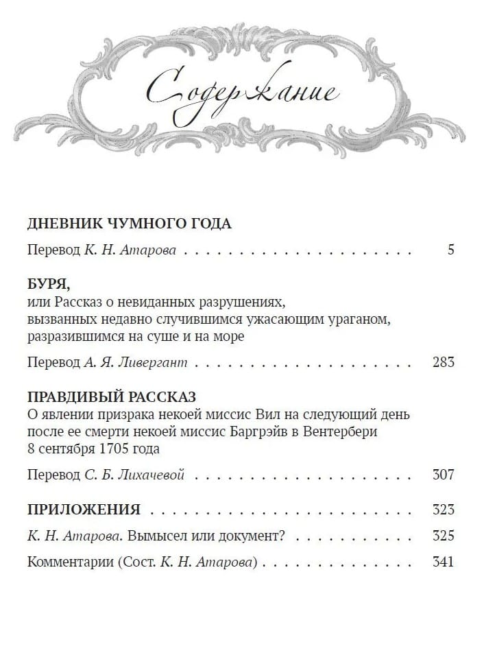 Центральное место занимает «Дневник чумного года» — псевдодокументальный роман, созданный на основе реальных событий эпидемии чумы в Лондоне в 1665 году. Через голос вымышленного горожанина, не покинувшего город в разгар бедствия, Дефо воссоздаёт атмосферу страха, хаоса, веры и отчаяния. Детальные описания жизни, статистика, свидетельства и философские размышления делают роман мощным свидетельством эпохи и размышлением о человеке перед лицом всеобщей гибели. В эссе «Буря» Дефо запечатлевает разрушительный ураган 1703 года, соединяя репортаж, свидетельства очевидцев и моральные выводы. «Правдивый рассказ о явлении призрака» — краткая повесть в жанре ранней мистической прозы, основанная на реальной истории, где переплетаются вера, суеверие и сверхъестественное.