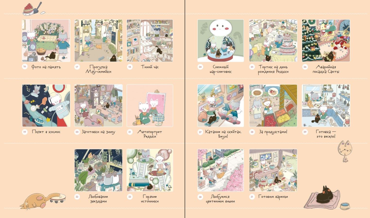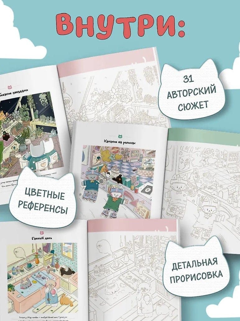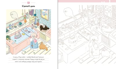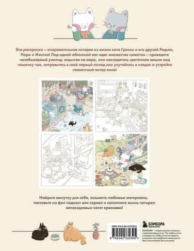 Эта раскраска — милая повседневная история о коте Гречке и его друзьях Редьке, Нори и Желтке. Под одной обложкой — множество сюжетов: отдых на море, уютные чаепития, уютный вечер кино и многое другое!