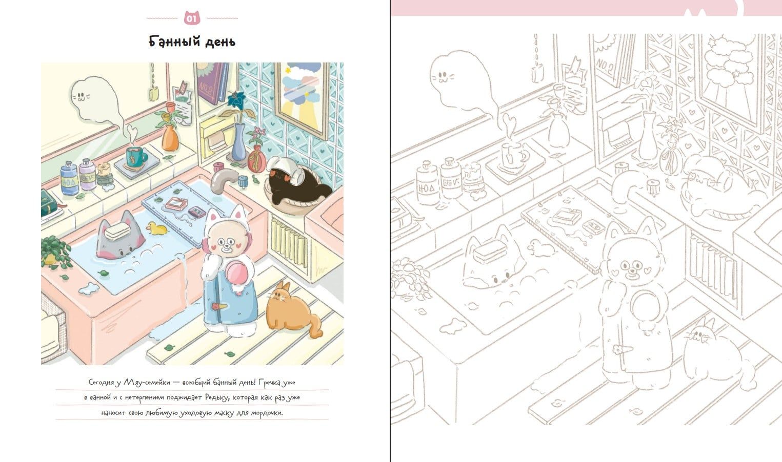 Счастливые дни кота Гречки. Приключения Мяу-семейки. Милая корейская раскраска-антистресс
