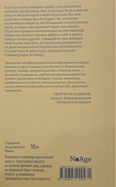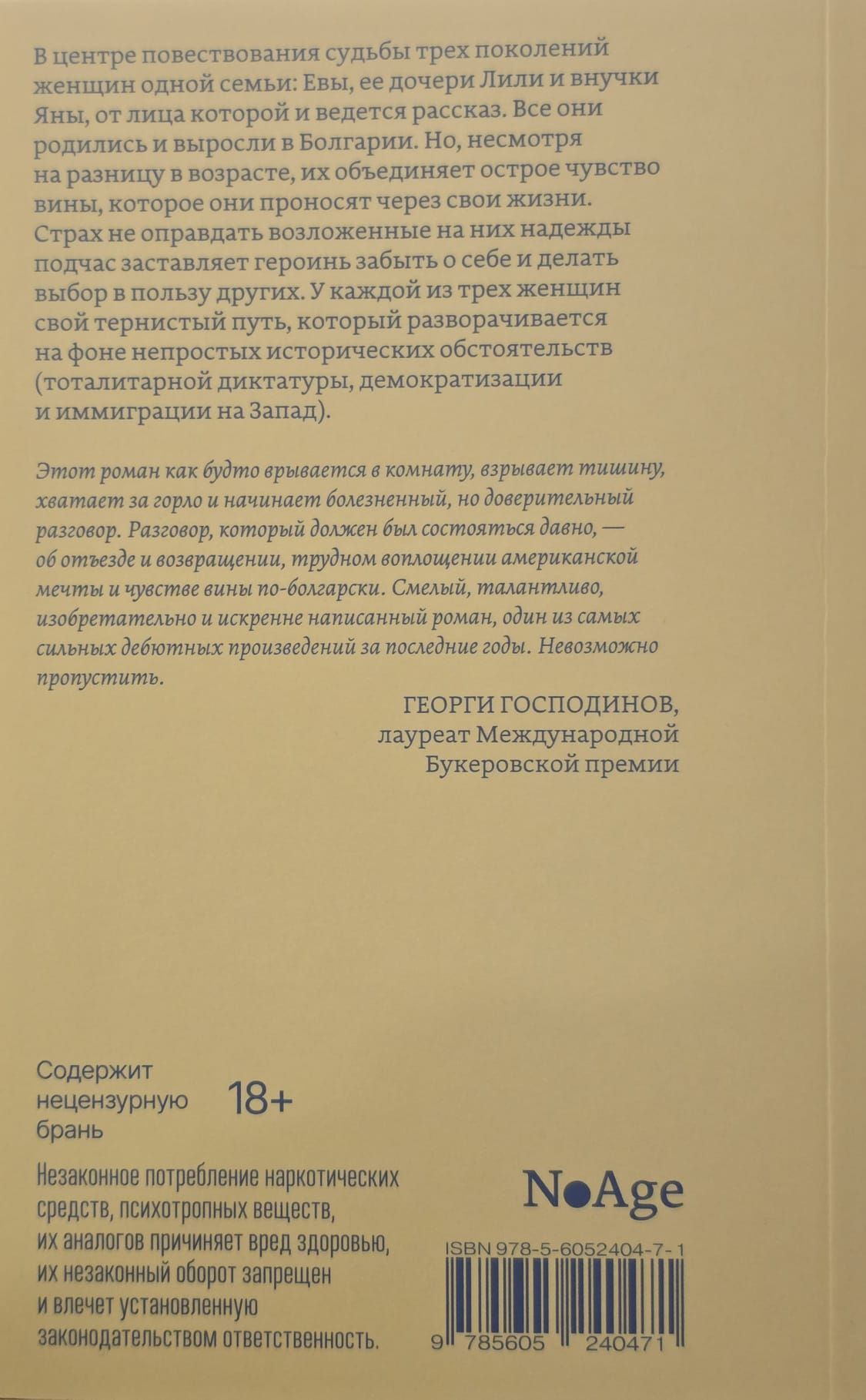 В центре повествования судьбы трех поколений женщин одной семьи: Евы, ее дочери Лили и внучки Яны, от лица которой и ведется рассказ. Все они родились и выросли в Болгарии. Но, несмотря на разницу в возрасте, их объединяет острое чувство вины, которое они проносят через свои жизни. Страх не оправдать возложенные на них надежды подчас заставляет героинь забыть о себе и делать выбор в пользу других. У каждой из трех женщин свой тернистый путь, который разворачивается на фоне непростых исторических обстоятельств (тоталитарной диктатуры, демократизации и иммиграции на Запад).