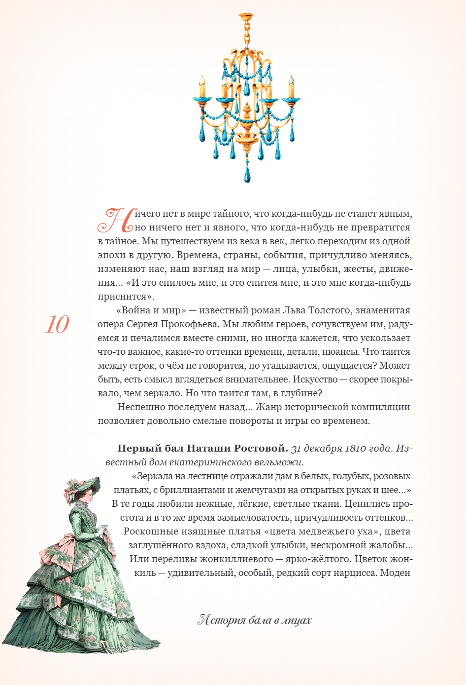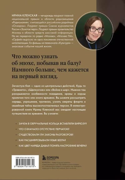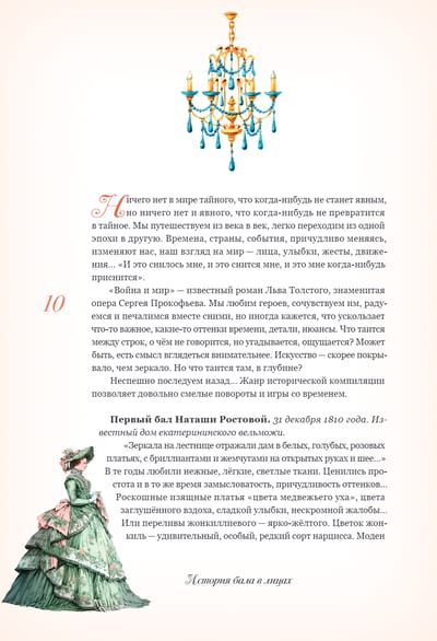 Бал — это зеркало светского общества: тут завязываются тайные романы, обсуждаются важные сделки, и все это не отрываясь от головокружительных танцев и необходимых ритуалов. Автор книги, известная радиоведущая Ирина Кленская, предлагает нам рассмотреть историю с необычного ракурса, беря на вооружение сцены балов и приемов, описанные в известных произведениях: «Травиате», «Щелкунчике», «Иоланте», «Войне и мире», «Борисе Годунове» и «Фаусте». Опуская сухое перечисление фактов, Ирина Кленская погружает читателя в исторический контекст мягко, снабжая отрывки из мировых шедевров своими комментариями и наблюдениями, взятыми из документальных источников. Вся книга же представляет собой увлекательное путешествие, сопровождаемое многочисленными иллюстрациями явлений и героев.