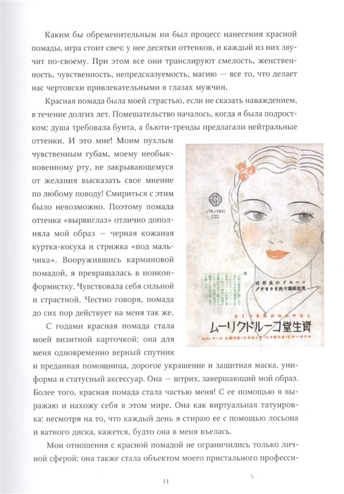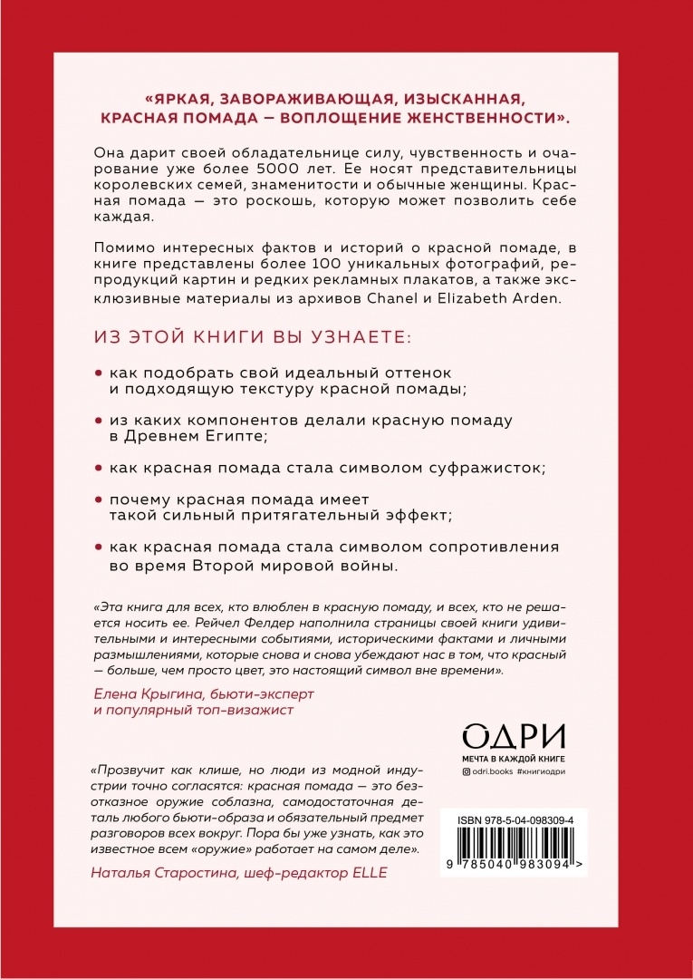 Эта потрясающе красивая книга – шикарный подарок всем, кто интересуется историей макияжа. Ее написала Рейчел Фелдер, известная журналистка и горячая поклонница красной помады. Вас ждет биография красной помады в историческом контексте, факты из жизни знаменитых женщин, которые ею пользовались, и советы, как найти свой идеальный оттенок и текстуру. Книга – настоящий праздник для глаз: в ней много репродукций картин, уникальных фотографий, стильных иллюстраций и редких рекламных плакатов, которые раскрывают магию красной помады, притягательную силу и несокрушимую мощь, сопровождающие ее с момента зарождения цивилизаций и до сегодняшнего дня. Теперь каждая женщина сможет взглянуть на красную помаду другими глазами.