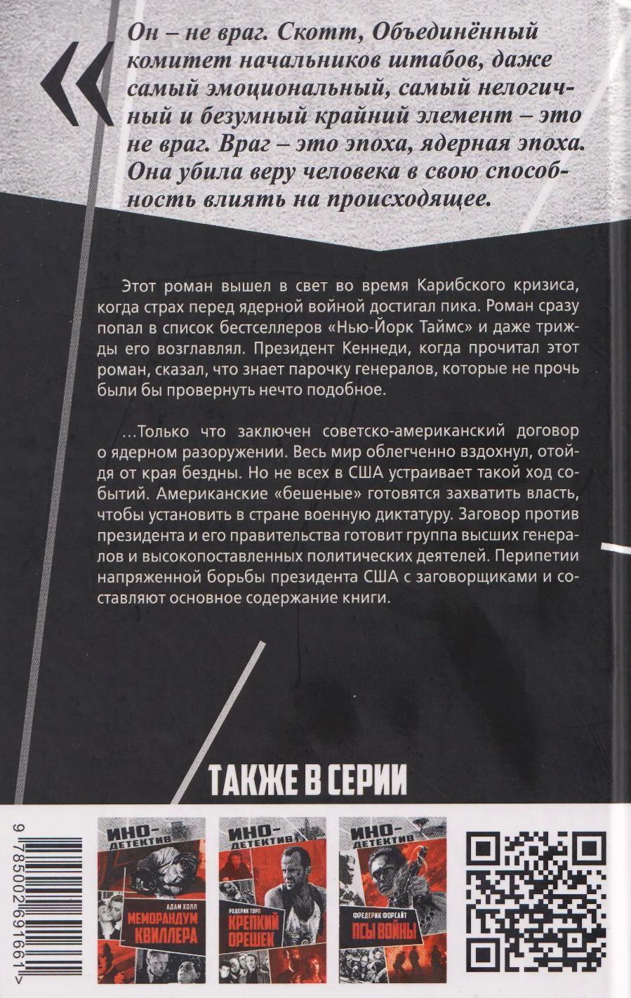 Этот роман вышел в свет во время Карибского кризиса, когда страх перед ядерной войной достигал пика. Роман сразу попал в список бестселлеров «Нью-Йорк Таймс» и даже трижды его возглавлял. Президент Кеннеди, когда прочитал этот роман, сказал, что знает парочку генералов, которые не прочь были бы провернуть нечто подобное. …Только что заключен советско-американский договор о ядерном разоружении. Весь мир облегченно вздохнул, отойдя от края бездны. Но не всех в США устраивает такой ход событий. Американские «бешеные» готовятся захватить власть, чтобы установить в стране военную диктатуру. Заговор против президента и его правительства готовит группа высших генералов и высокопоставленных политических деятелей. Перипетии напряженной борьбы президента США с заговорщиками и составляют основное содержание книги.