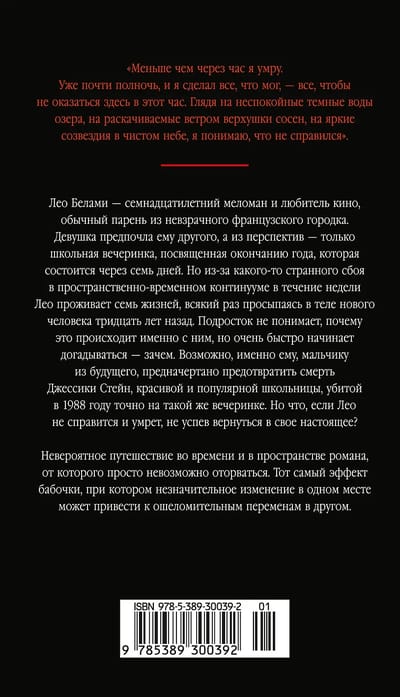Лео Белами — семнадцатилетний меломан и любитель кино, обычный парень из невзрачного французского городка. Девушка предпочла ему другого, а из перспектив — только школьная вечеринка, посвященная окончанию года, которая состоится через семь дней. Но из-за какого-то странного сбоя в пространственно-временном континууме в течение недели Лео проживает семь жизней, всякий раз просыпаясь в теле нового человека тридцать лет назад. Подросток не понимает, почему это происходит именно с ним, но очень быстро начинает догадываться — зачем. Возможно, именно ему, мальчику из будущего, предначертано предотвратить смерть Джессики Стейн, красивой и популярной школьницы, убитой в 1988 году на точно такой же вечеринке. Но что, если Лео не справится и умрет, не успев вернуться в свое настоящее?