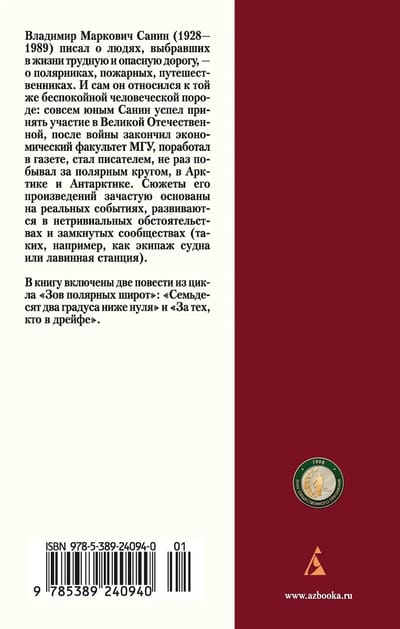 Владимир Маркович Санин (1928—1989) писал о людях, выбравших в жизни трудную и опасную дорогу, — о полярниках, пожарных, путешественниках. И сам он относился к той же беспокойной человеческой породе: совсем юным Санин успел принять участие в Великой Отечественной, после войны закончил экономический факультет МГУ, поработал в газете, стал писателем, не раз побывал за полярным кругом, в Арктике и Антарктике. Сюжеты его произведений зачастую основаны на реальных событиях, развиваются в нетривиальных обстоятельствах и замкнутых сообществах (таких, например, как экипаж судна или лавинная станция). В книгу включены две повести из цикла «Зов полярных широт»: «Семьдесят два градуса ниже нуля» (1975) и «За тех, кто в дрейфе» (1978).