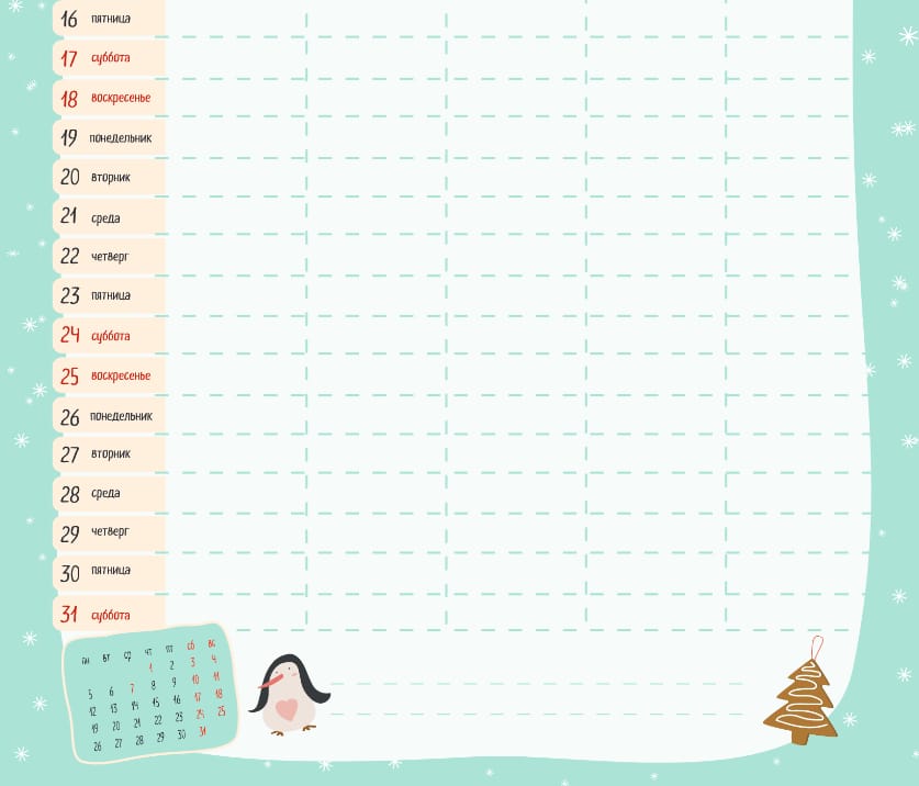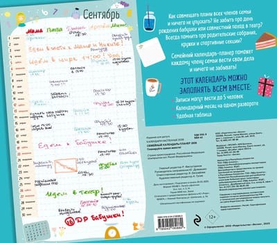Пользоваться календарем-планером приятно и легко. Внутри — таблица с пятью колонками для записи имен членов семьи, планов и событий, а также дополнительные линейки для особо важных дел или дней рождения.