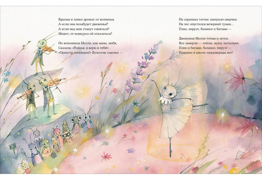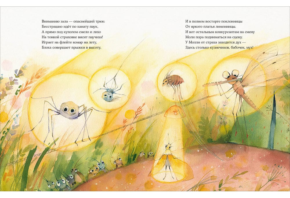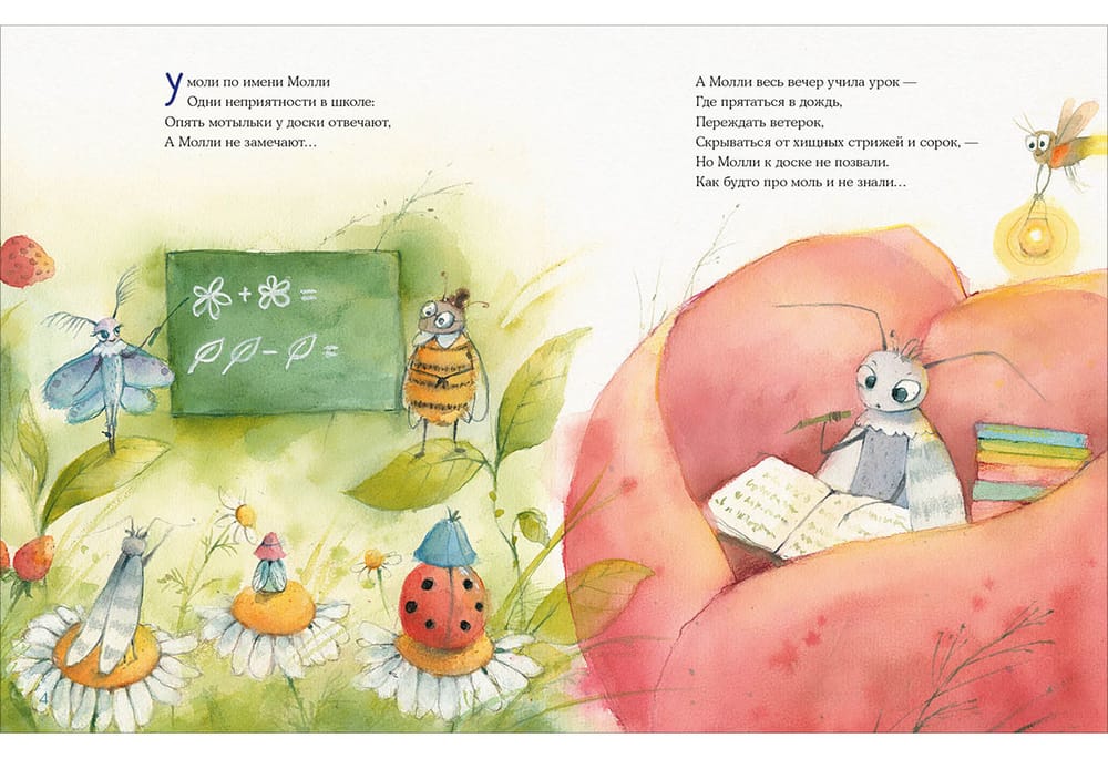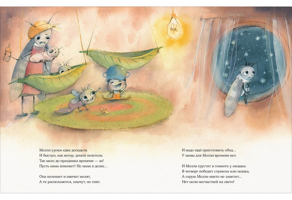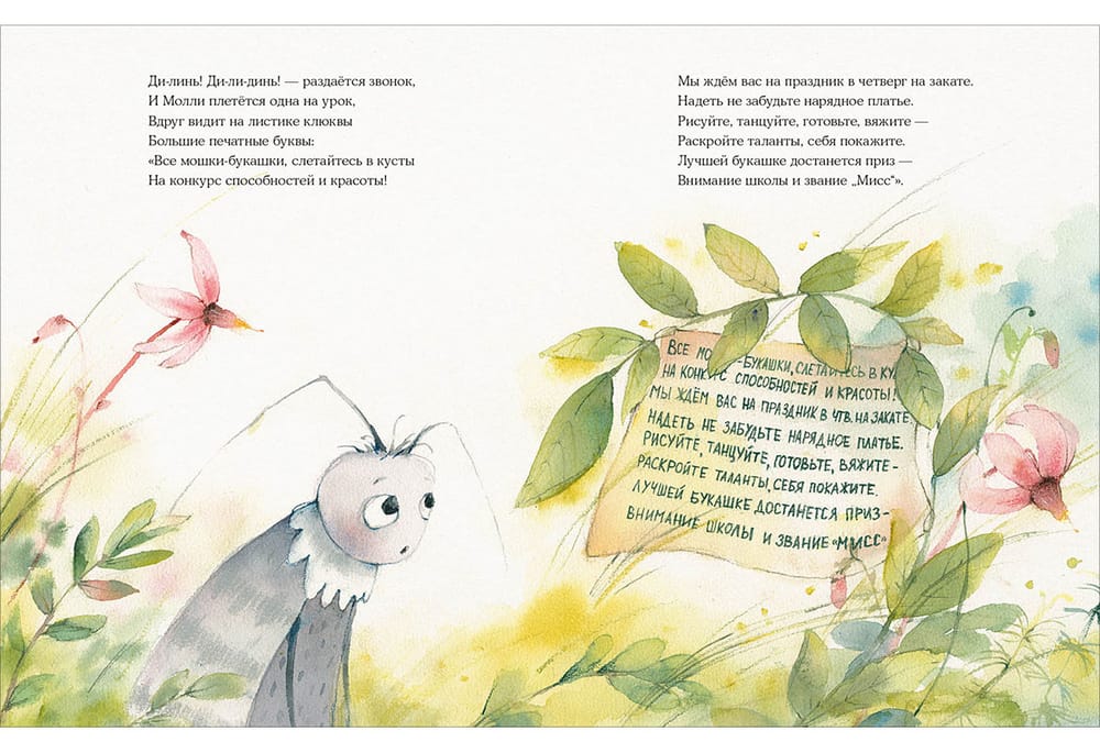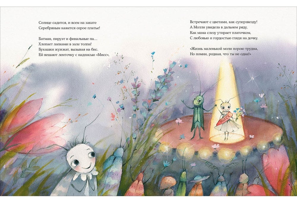 Серая моль Молли так бледна и невзрачна, что никто её не замечает — ни на уроках, ни в играх. Так обидно! Ведь Молли тоже хочется дружить с кем-нибудь и не быть всё время одной. И вот однажды в школе объявили конкурс на звание «Мисс»! Ах, если бы Молли смогла победить! Тогда бы её обязательно заметили, и, может быть, у неё бы появились подруги… Но чем удивить жюри и зрителей? Ведь Молли не рисует, не вяжет, не умеет громко жужжать и не может похвастаться яркими крылышками. Как же быть? И тут на помощь приходит… мама!