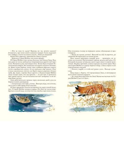 Серой Шейке предстоит провести холодную зиму совсем одной. Все её сородичи улетели в тёплые края. Но она не отчаивается и даже находит друга — Зайца. Всё бы ничего, но только к реке начала приходить Лиса… Сможет ли уточка со сломанным крылышком спастись от коварной Лисы? Любимую многими сказку проиллюстрировал художник, тонко чувствующий и понимающий природу, — Георгий Никольский.