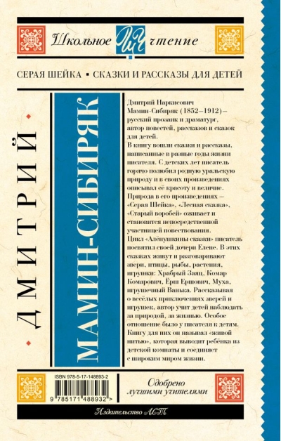 Дмитрий Наркисович Мамин-Сибиряк (1852–1912) – русский прозаик и драматург, автор повестей, рассказов и сказок для детей. В книгу вошли сказки и рассказы, написанные в разные годы жизни писателя. С детских лет писатель горячо полюбил родную уральскую природу и в своих произведениях описывал её красоту и величие. Природа в его произведениях оживает и становится непосредственной участницей повествования: «Серая шейка», «Лесная сказка», «Зелёная война», «Старый воробей». Цикл «Алёнушкины сказки» писатель посвятил своей дочери Елене. В этих сказках живут и разговаривают звери, птицы, рыбы, растения, игрушки: Храбрый Заяц, Комар Комарович, Ёрш Ершович, Муха, игрушечный Ванька. Рассказывая о весёлых приключениях зверей и игрушек, автор учит детей наблюдать за природой, за жизнью. Особое отношение было у писателя к детям. Книгу для них он называл «живой нитью», которая выводит ребенка из детской комнаты и соединяет с широким миром жизни.