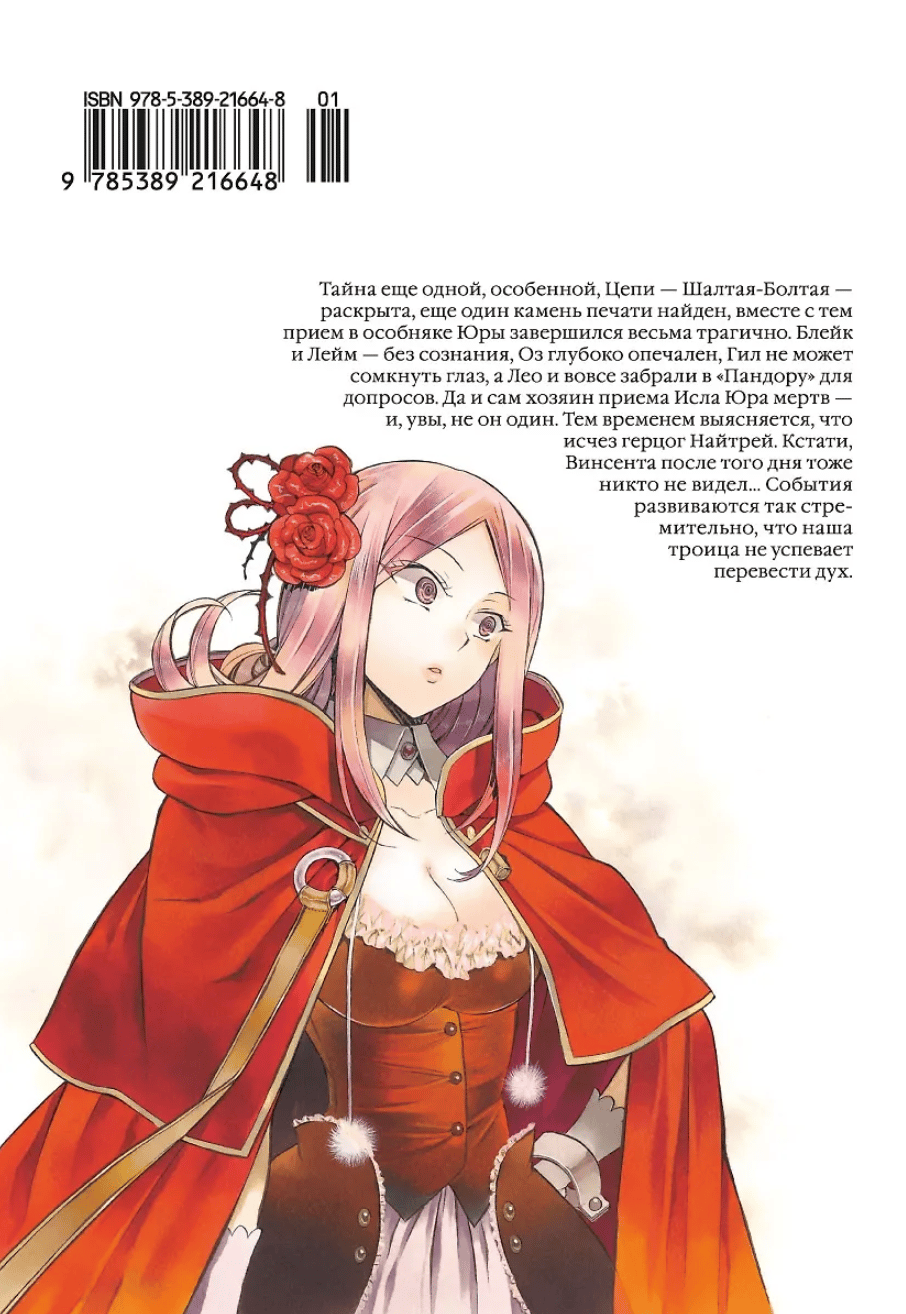 Тайна еще одной, особенной, Цепи – Шалтая-Болтая – раскрыта, еще один камень печати найден, вместе с тем прием в особняке Юры завершился весьма трагично. Блейк и Лейм – без сознания, Оз глубоко опечален, Гил не может сомкнуть глаз, а Лео и вовсе забрали в «Пандору» для допросов. Да и сам хозяин приема Исла Юра мертв – и, увы, не он один. Тем временем выясняется, что исчез герцог Найтрей. Кстати, Винсента после того дня никто не видел... События развиваются так стремительно, что наша троица не успевает перевести дух.
