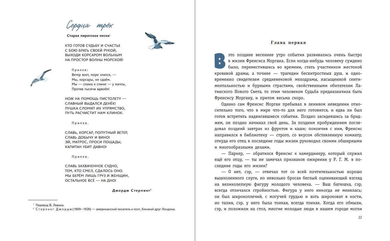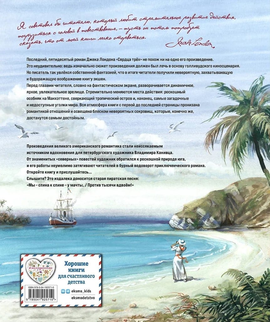 Джек Лондон назвал свой пятидесятый, юбилейный роман «Сердца трёх» новым направлением в творчестве. Книга, написанная в соавторстве с голливудским сценаристом Чарльзом Годдардом, изначально замышлялась как киносценарий. И это чувствуется с первых страниц. Динамичный сюжет, стремительная смена места действия, самые привлекательные элементы блокбастера: путешествия, поиски сокровищ, любовный треугольник, тайна рождения — всё свидетельствует о том, что и в качестве киносценариста автор обязательно обрёл бы мировую славу.