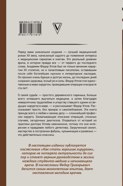 Перед вами уникальное издание – лучший медицинский роман XX века, написанные задолго до появления интереса к медицинским сериалам и книгам. Это реальный дневник хирурга, в котором правда все – от первого до последнего слова. Повествование начинается с блокадного Ленинграда, где Федор Углов и начал работать в больнице.