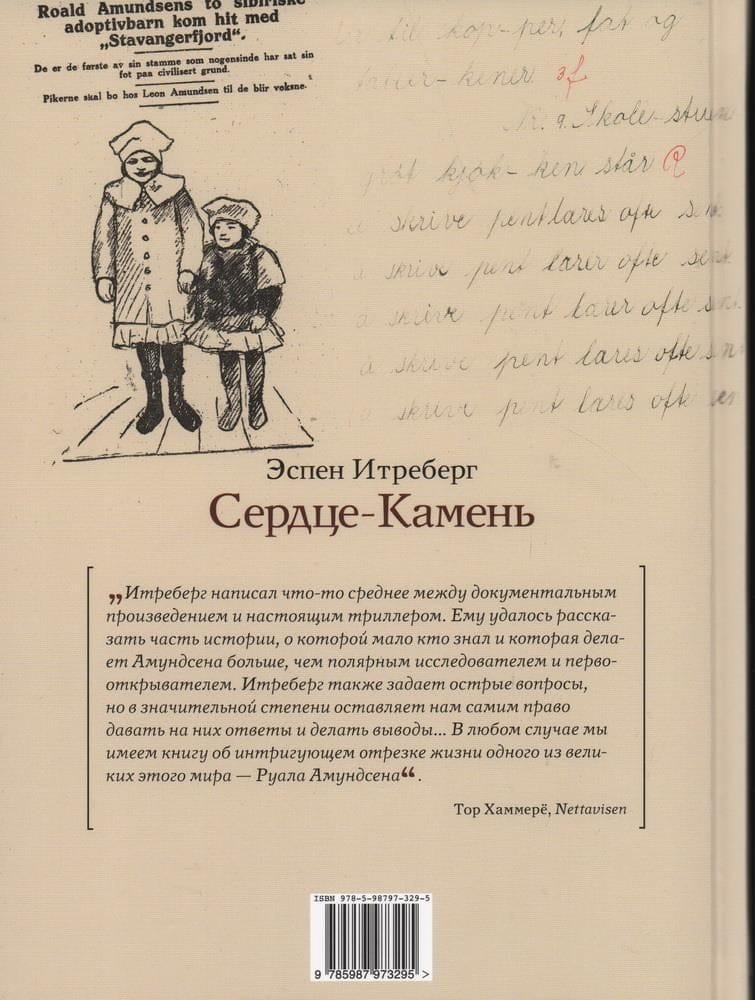 Руаль Амундсен - легенда покорения полюсов Земли, национальный герой Норвегии, "Наполеон полярных стран" et ceterа. Такого Амундсена знают все. Однако в его биографии есть не столь известный широкой публике факт — история удочерения им двух чукотских девочек. В 1921 году, после неудачной экспедиции на борту "Мод", великий полярный исследователь вернулся в свое имение Свартскуг на берегу Буннефьорда с двумя девочками - эскимоской 4 лет и полуэскимоской приблизительно 12-ти. Несколько лет, в период между двумя мировыми войнами, жизни Руала Амундсена, Камиллы Карпендейл и Ниты Какот Амундсен переплетались между собой. Вся эта личная, весьма сложная и противоречивая история — двух детей и взрослого, всемирно известного полярника — стала предметом интереса известного норвежского автора и исследователя жизни Р. Амундсена Эспена Итреберга. Книга рассказывает о жизненном пути Ниты Какот и Камиллы Карпендейл, о том, как их судьба причудливым образом переплелась с судьбой самого Амундсена, и почему ему пришлось вернуть их на родину. Эта история о силах, которые сначала свели, а потом разъединили их. Сегодня читатели могут познакомиться с этой непростой историей и ответить на вопрос: все же сердце — камень? Автор книги опирался не только на документальные источники, но и на личные впечатления от поездок по тем местам, где жили девочки во время своих странствий.