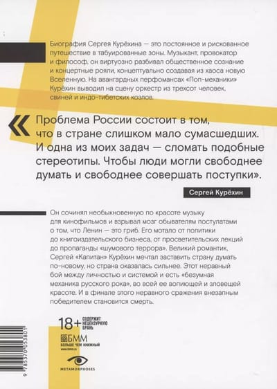 «Безумная механика русского рока» — это книга о судьбе и творческом горении Мастера, написанная так проникновенно и увлекательно, полная таких неожиданных деталей и незабываемых диалогов, что, будучи документально-биографическим повествованием, читается почти как художественное произведение.