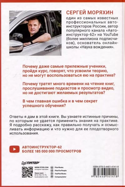 Сергей Моряхин один из самых известных профессиональных автоинструкторов России, автор популярного канала «Автоинструктор-62» на YouTube (более миллиона подписчиков), основатель онлайн-школы «Наука вождения». Почему даже самые прилежные, пройдя курс, говорят, что усвоили теорию, но не могут воспользоваться ею в реальных условиях? Почему тратят много времени на чтение книг, прослушивание подкастов и просмотр видео, но не достигают желаемых результатов? В чём главная ошибка и в чём секрет успешного обучения? Ответы он даст в этой книге. Вы узнаете истинные причины, по которым не удаётся применить знания на практике. Он подробно расскажет, как правильно получать и осмысливать информацию, и что нужно для ее плодотворного использования.